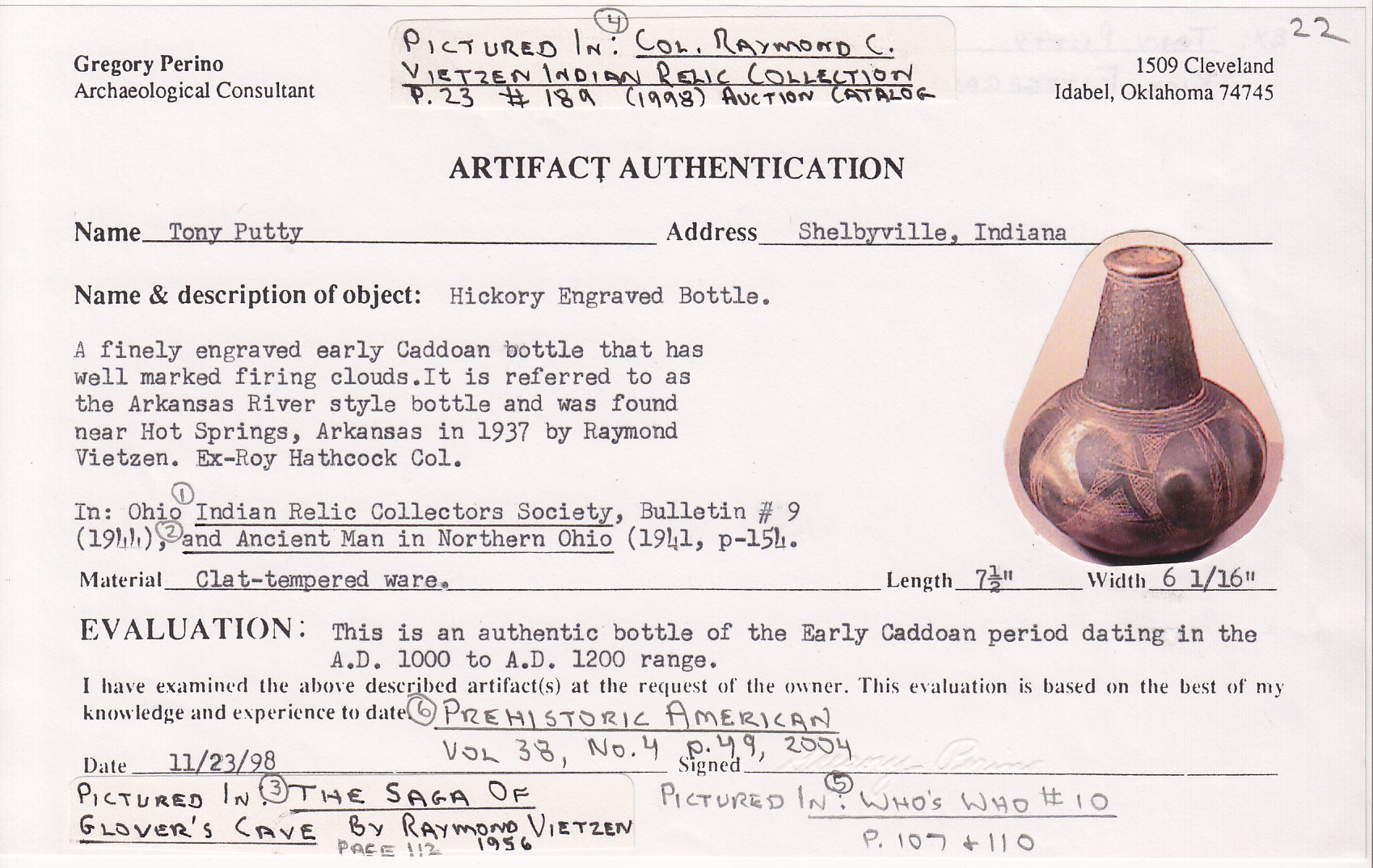 AD 1000-1200, one of the finest bottles in existence today. Found by Raymond Vietzen near Hot Springs, AR. All original, NO crack, NO Glue, NO restoration. FINE G-10+ and pictured 6 times.