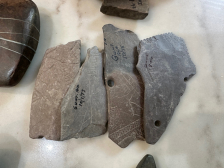 Another frame of miscellaneous stone items for you to enjoy. There are a couple of small game stones, an unfinished Plummet, a grooved weight or Bolo, small stone bowl or paint cup. A fluted boatstone or loafstoner on top row and in the center is a fine Engraved Hematite LoafStone with a dimple in the center of the bottom. I am sure the dimple was used to hold the Artifact in one exact position.