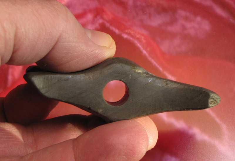 Extremely Rare Bannerstone made of Greenish Gray and Black Slate from Holmes County Ohio near Killbuck. This Bannerstone is pictured in WW#7 page 191 and has been in the collections of Sam Copeland, William Tiell. There is a item #T-350 on the bannerstone and could possibly be an Earl Townsend collection number but I am not certain.