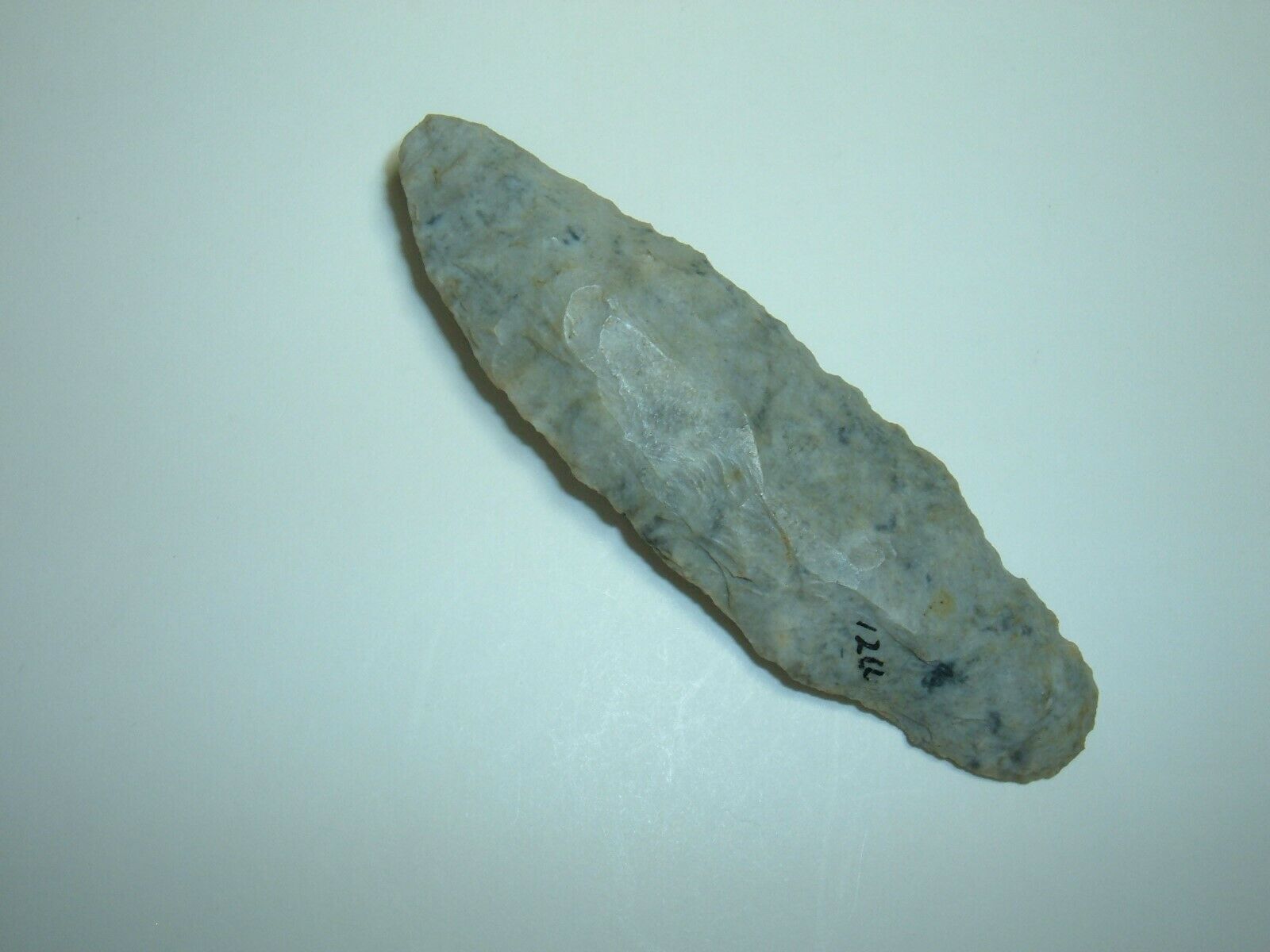Offered from our collections is  a  EXCELLENT EARLYADENA  POINT FROM COSHOCTON  CO. OHIO NICE & LARGE  3 7/16"  EX. SIMON  THIS POINT CAME FROM  A BOB CONVERSE AUCTION AND IS SUPER WELL MADE & COLORFUL MATERIAL WHICH LOOKS MUCH LIKE FLINT RIDGE BUT I BELIEVE IT IS COLORFUL,HIGH GRADE COSHOCTON, GRAYISH CREAM WITH BLUE SPECKS , A NICE LOOKING POINT!!!!(SEE PICTURES),VERY PLEASING TO THE EYE WELL FLAKED & JUST A NICE EXAMPLE OF EARLY   ADENA WORKMANSHIP! A VERY NICE RELIC INDEED ! YOU WILL NOT BE DISAPPOINTED!