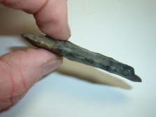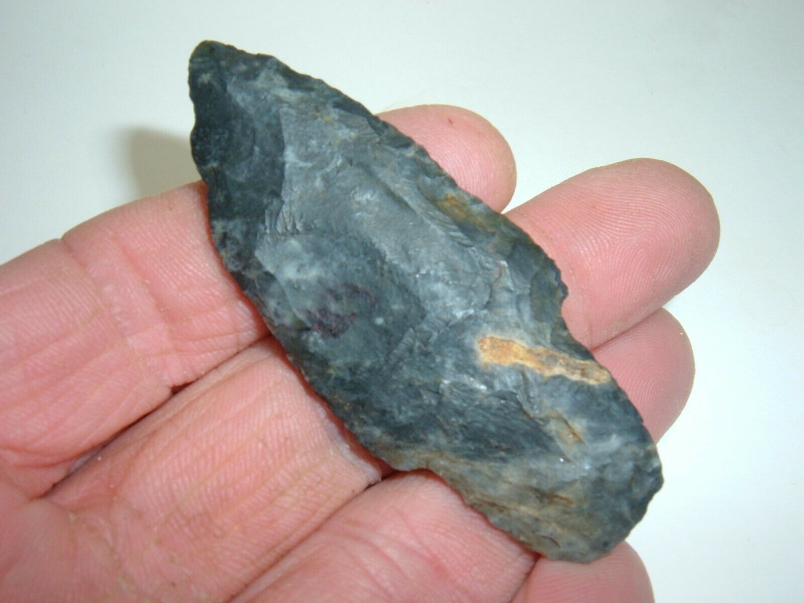 Offered from our collections is a SUPER OHIO BEAVERTAIL ADENA POINT, WITH NICE SIZE , 2 3/4" FROM TUSCAWARAS CO. OHIO AND MATERIAL BEING HIGHLY SOUGHT AFTER MOTTLED BLACK COSHOCTON FLINT! EX JIM BARKER WHO SADLY PASSED AWAY A FEW YEARS BACK AND HAD A GREAT EYE FOR QUALITY FLINT! HAS A LITTLE "STACK" NEAR THE TIP ON ONE SIDE,DOES NOT HURT THIS GENUINE ARTIFACT IN MY EYES,A REAL NICE POINT!