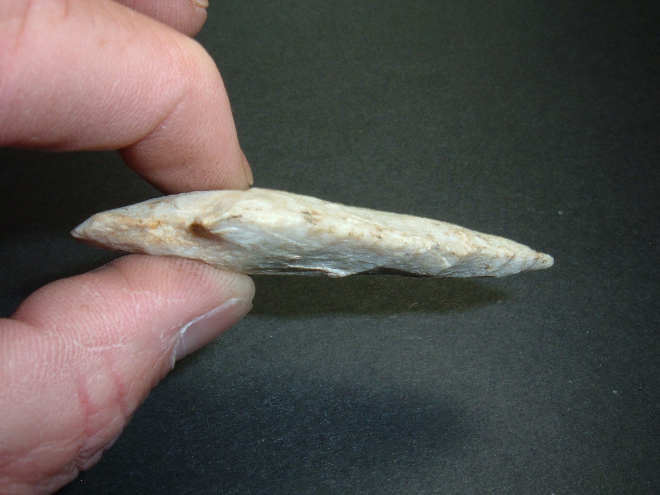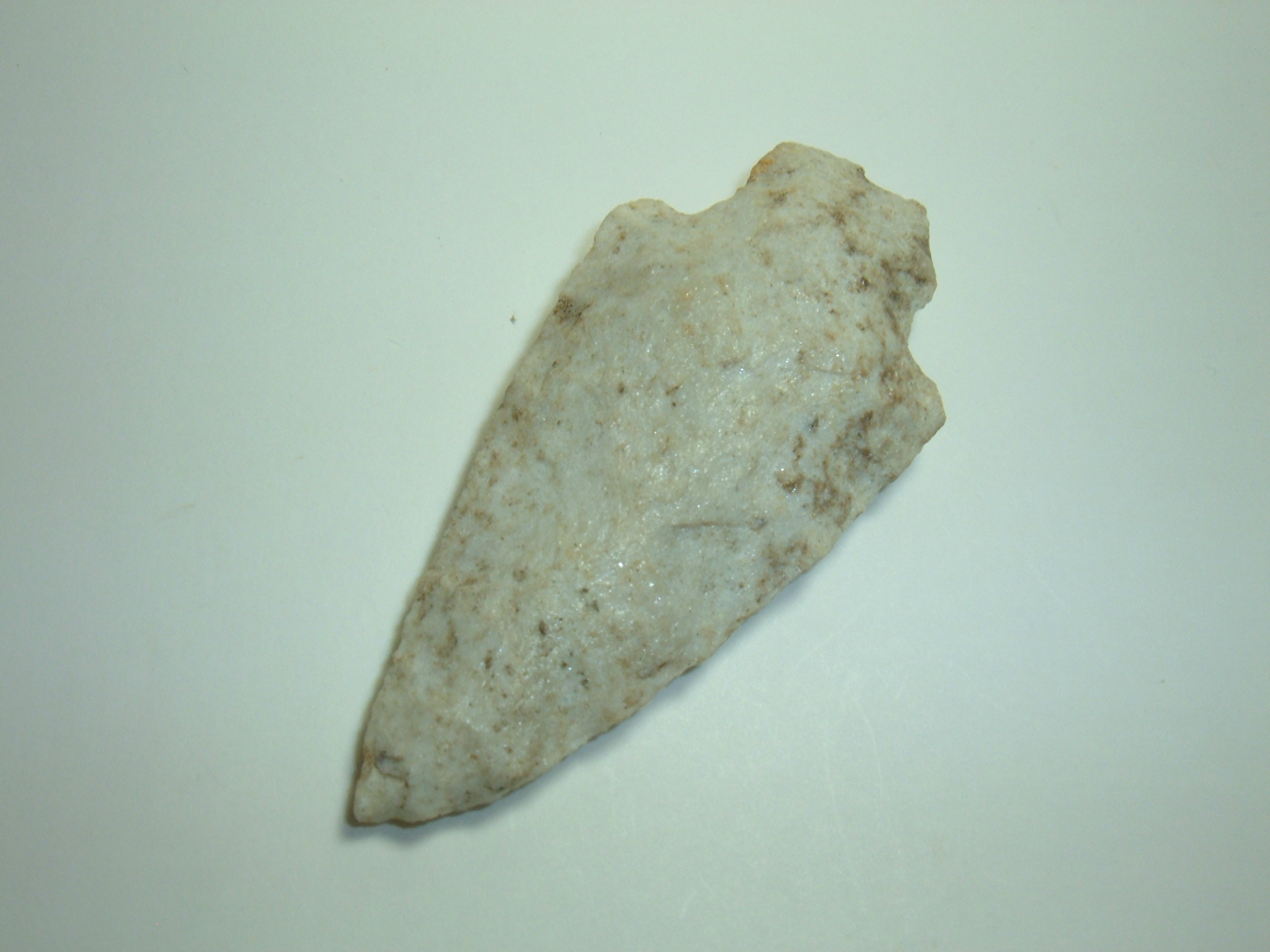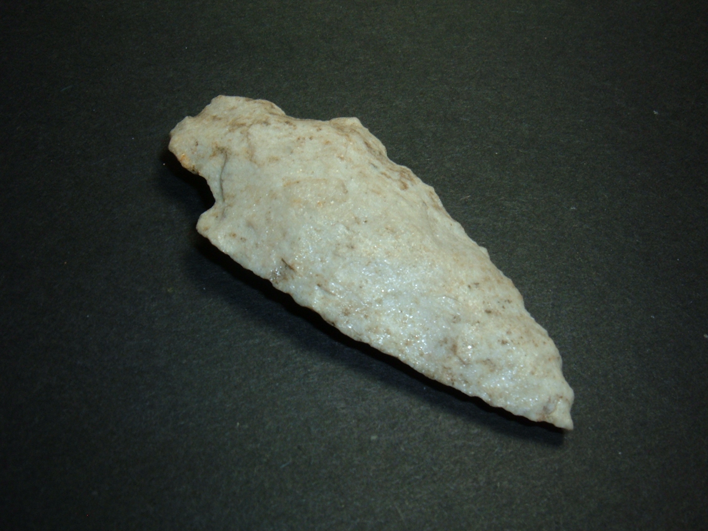 FROM OUR PERSONAL COLLECTIONS COMES THIS FINE HEAVY STEMMED ARCHAIC POINT 2 7/8" FROM PIKE CO. OHIO AND MADE FROM RATHER RARE MATERIAL FOR OHIO,SUGER QUARTZ! VERY FINELY MADE FOR THE TYPA AND FLAKED VERY NICELY FOR QUARTZITE! NICE EXAMPLE IN A RATHER RARE MATERIAL!