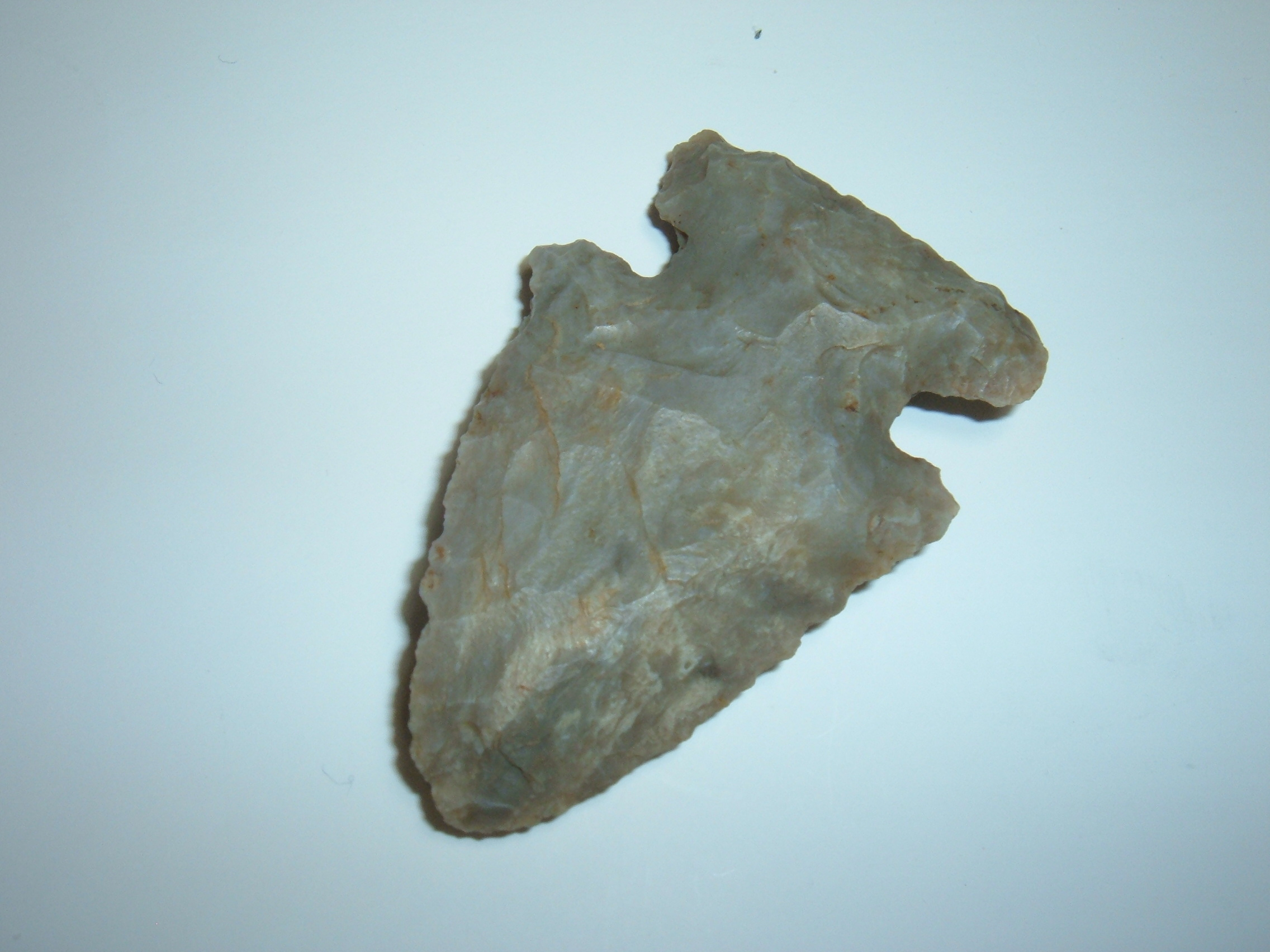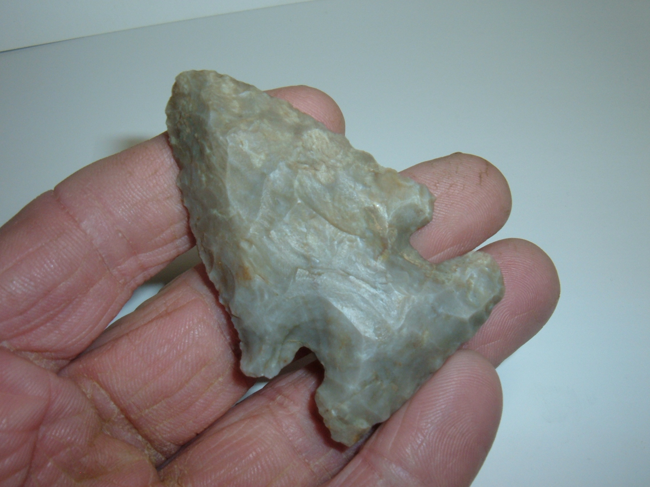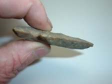 HERE IS A REAL KILLER E-NOTCH, RIGHT OUT OF OUR OWN PERSONAL DISPLAY FRAMES,THIS SUPER FINE ARCHAIC EXPANDED NOTCH, 2 1/2" IS SURE TO PLEASE ANY COLLECTOR WHO COLLECTS THE THEBES/BEVEL COMPLEX OF THESE POINTS! FROM LICKING CO. OHIO,THIS BEVEL LOOKS BIGGER PROBABLY BECAUSE OF IT'S WIDTH! MATERIAL IS MOTTLED GRAY COSHOCTON FLINT AND VERY SHARPLY BEVELED ON BOTH SIDES! EX,JIM BARKER , A NAME WELL KNOWN TO OHIO COLLECTORS FOR AMASSING A HUGE COLLECTION OF QUALITY RELICS! YOU WILL NEVER FEEL BAD ABOUT THIS ONE!