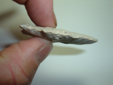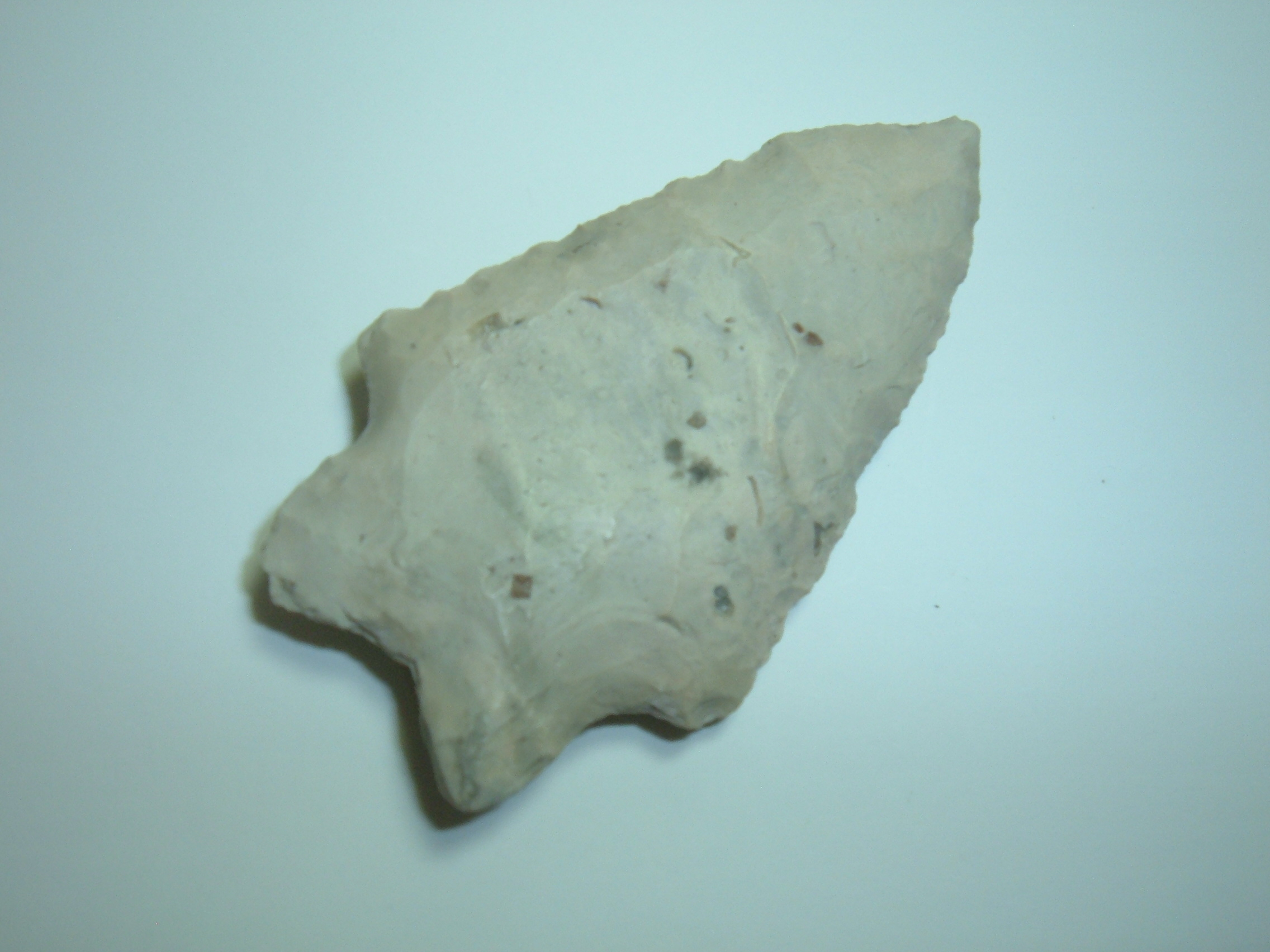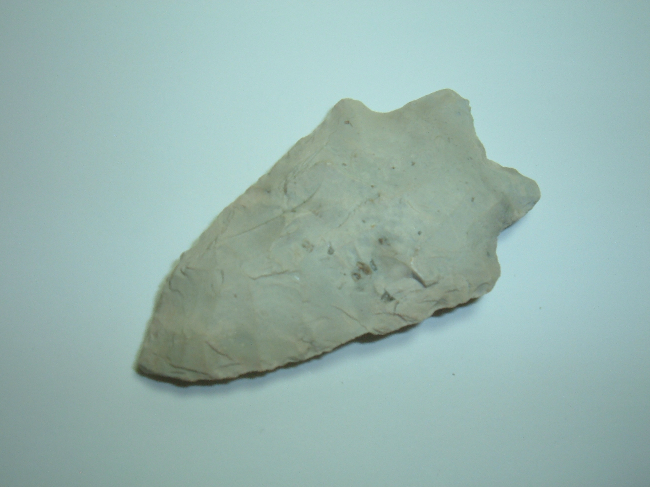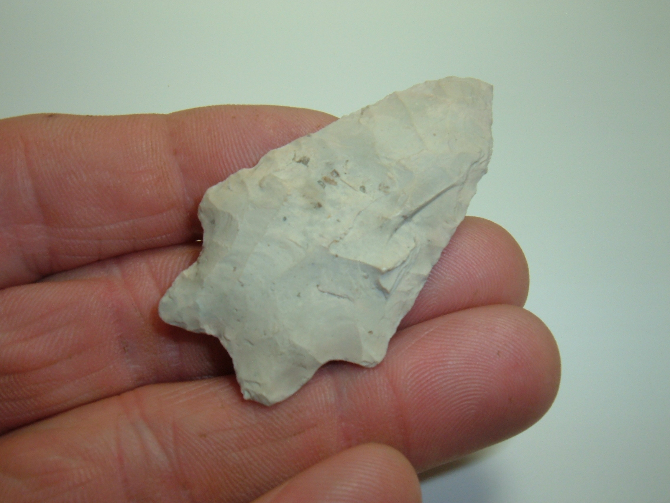 HERE'S ANOTHER REALLY FINE PALEO TRANSITIONAL, 2 1/8" FROM MARION CO. OHIO AND IS MADE FROM NICE WHITE LOGAN CO. CHERT. EX DON SHORT ANOTHER GREAT OHIO COLLECTOR OF AUTHENTIC RELICS! VERY NICELY MADE AND SHAPED WITH A NEAT BEVEL TO IT! EXCELLENT PIECE!