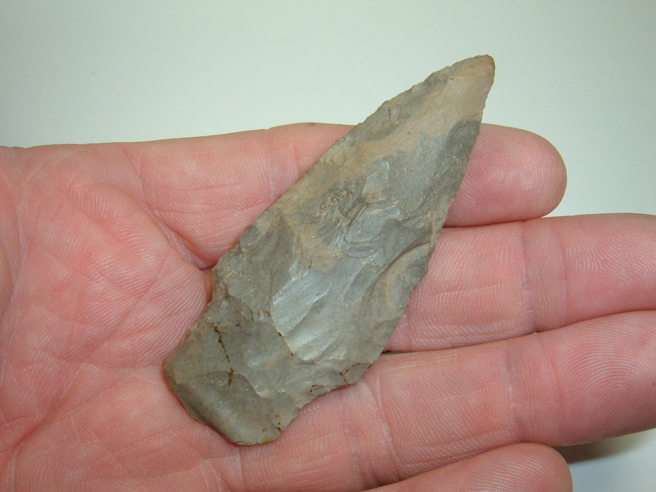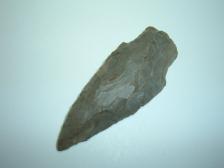 HERE IS A LARGE ARCHAIC STEMMED SPREAR 3" FROM OUR PERSONAL COLLECTIONS AND FROM LICKING CO.OHIO. MATERIAL IS NICE DELAWARE CHERT . QUITE SYMMETRICAL AND NICELY FLAKED!