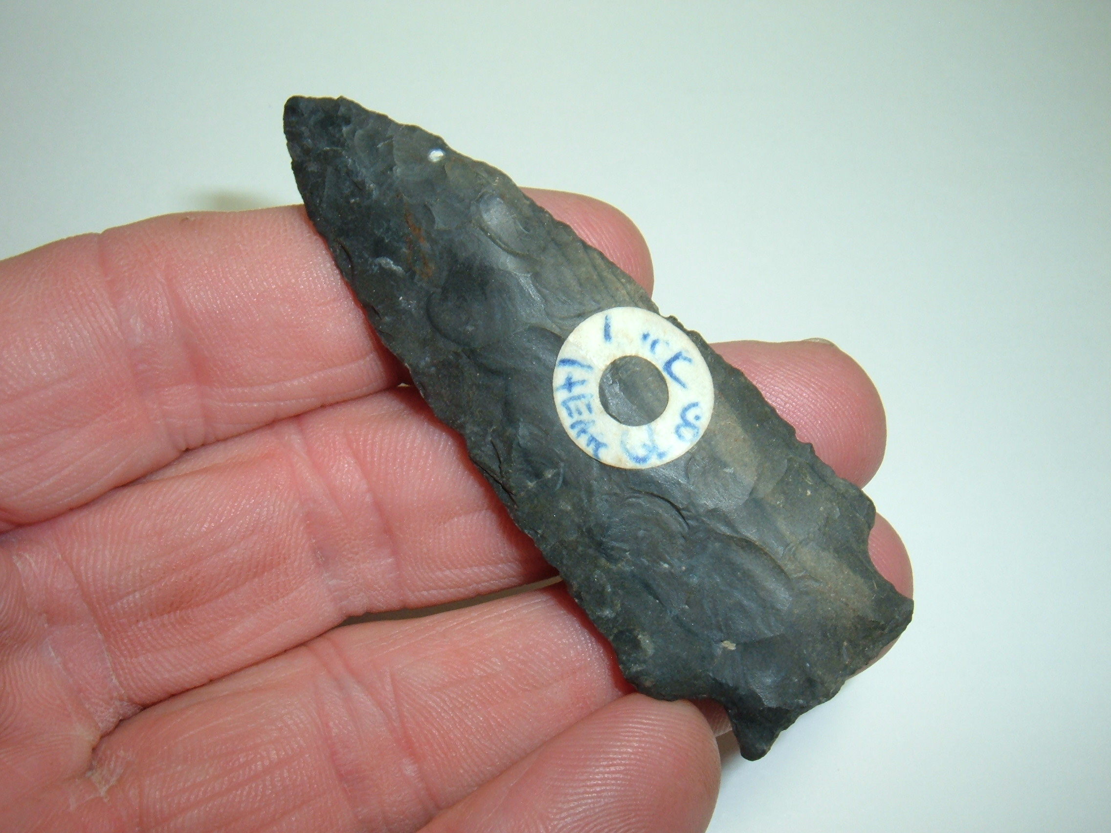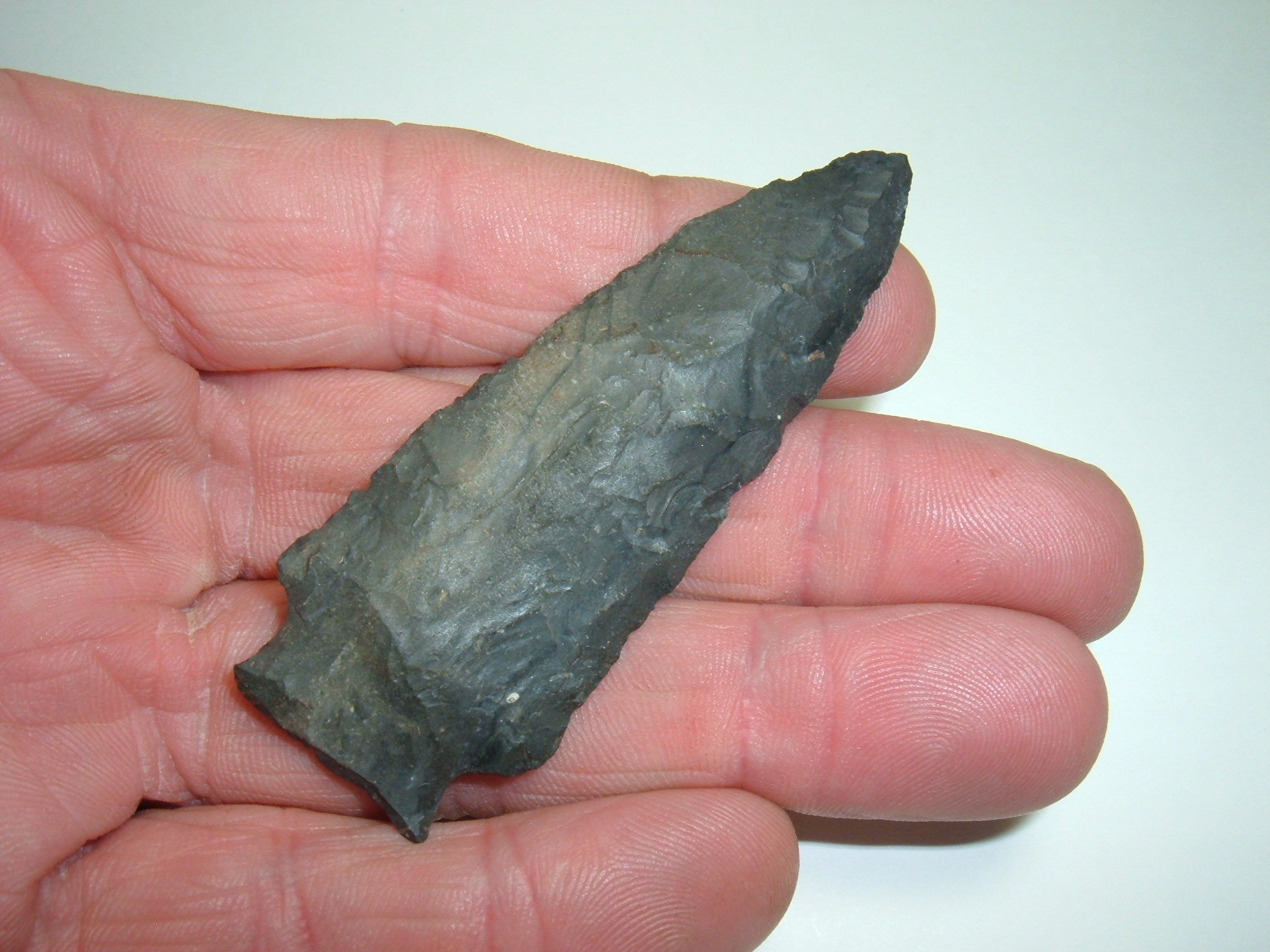 HERE WE HAVE A NICE LARGE ARCHAIC STEMMED POINT, 2 13/16" FROM LICKING CO.OHIO AND IS EX DAVE ELLIS. MATERIAL IS NICE COSHOCTON BLACK FLINT,AWESOME FLAKING AND A REAL BEAUTY!