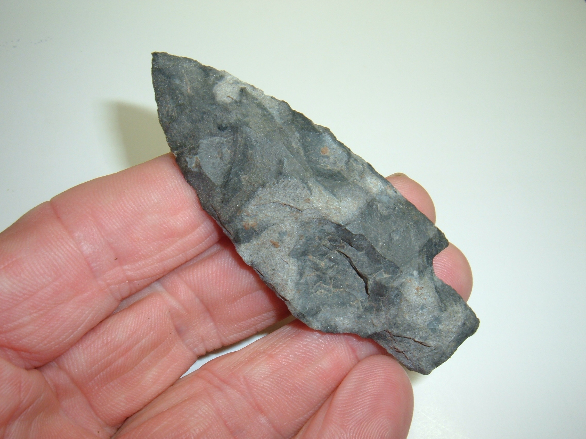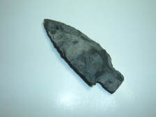 HERE'S A VERY UNUSUAL LOOKING ADENA, 3" FROM LICKING CO.OHIO AND MADE OF TWO TONE, VERY PRONOUNCED MOTTLED COSHOCTON FLINT THAT GIVES IT A UNUSUAL LOOK AND WITH WHAT I WOULD REFER TO AS SCOOPED OUT AREAS WHICH NO DOUBT CREATED FLAKING PROBLEMS FOR THE ANCIENT ARTISAN! STILL THEY DID A REMARKABLE JOB KEEPING VERY GOOD SYMMETRY TO THE POINT WITH THE ONLY CONCESSION BEING THAT ONE EAR WAS MADE LONGER THAN THE OTHERDUE TO THE "SCOOPED OUT RAEA OF THE FLINT! ACTUALLY A REMARKABLE POINT AND A TESTAMENT TO THE STILL OF PRIMITIVE MAN!