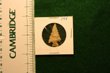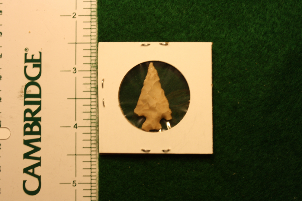 This arrowhead is about 1 1/4 in. long and 5/8 in. wide. The workmanship is keen with only a barb tip missing. It is kept in a protective coin folder for safety on display.