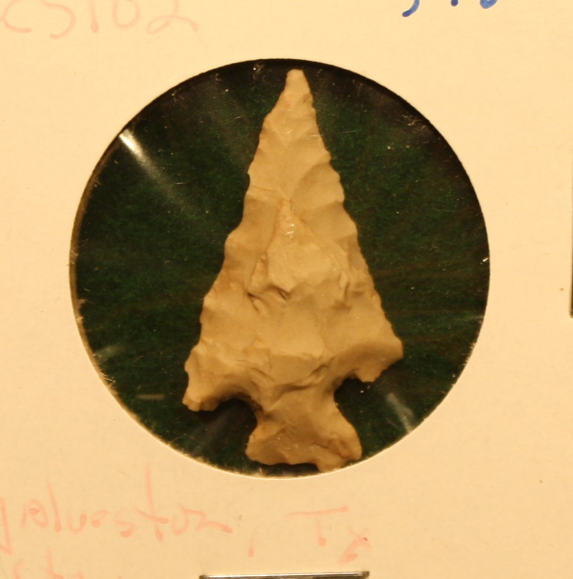 This was a personal find by me on a Rangia Clam Shell Midden in Galveston County, Texas. This site now has a Trinomial as a registered Prehistoric Archaeological Site.
