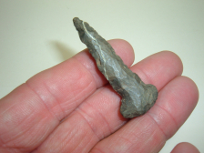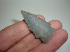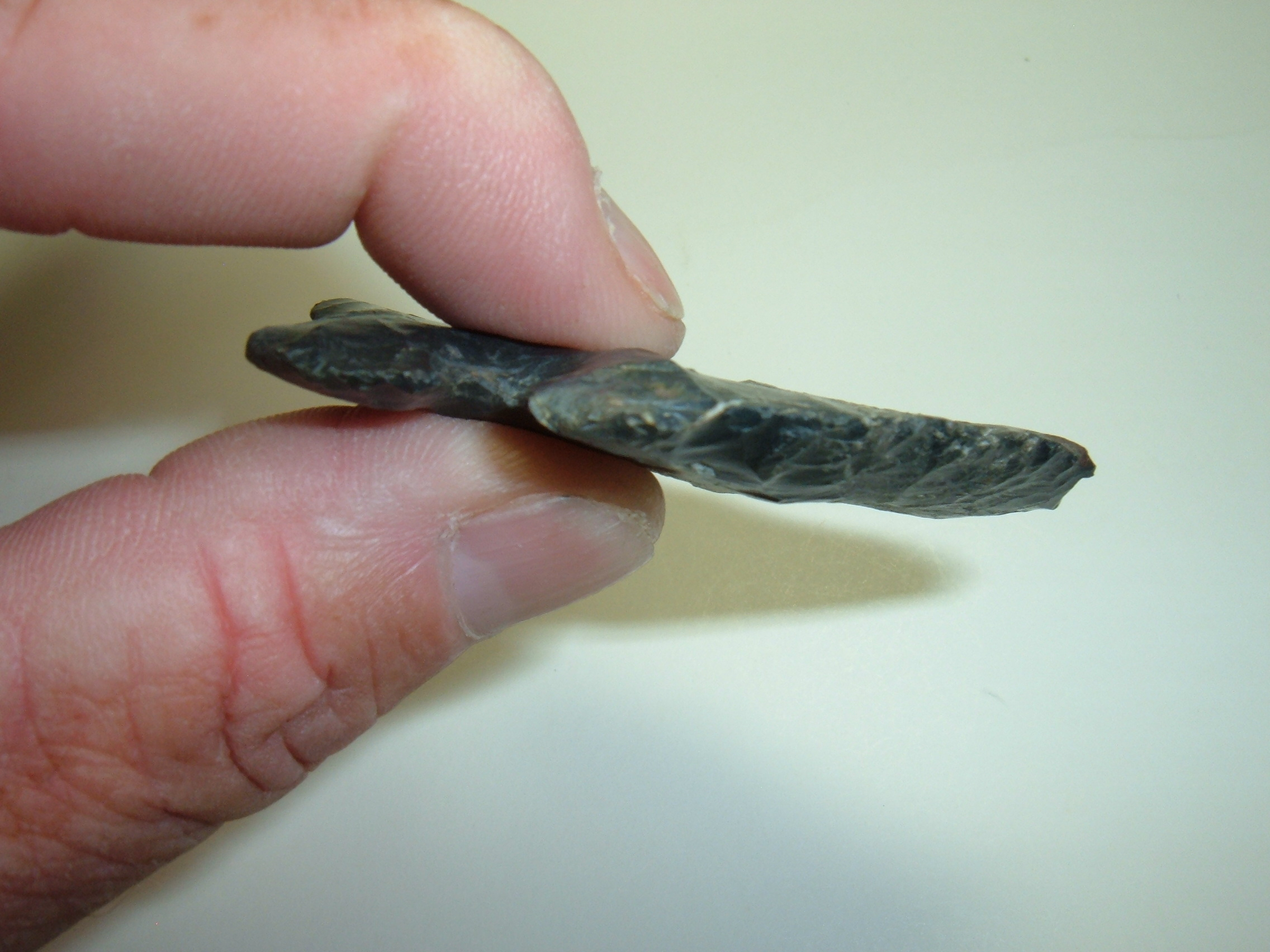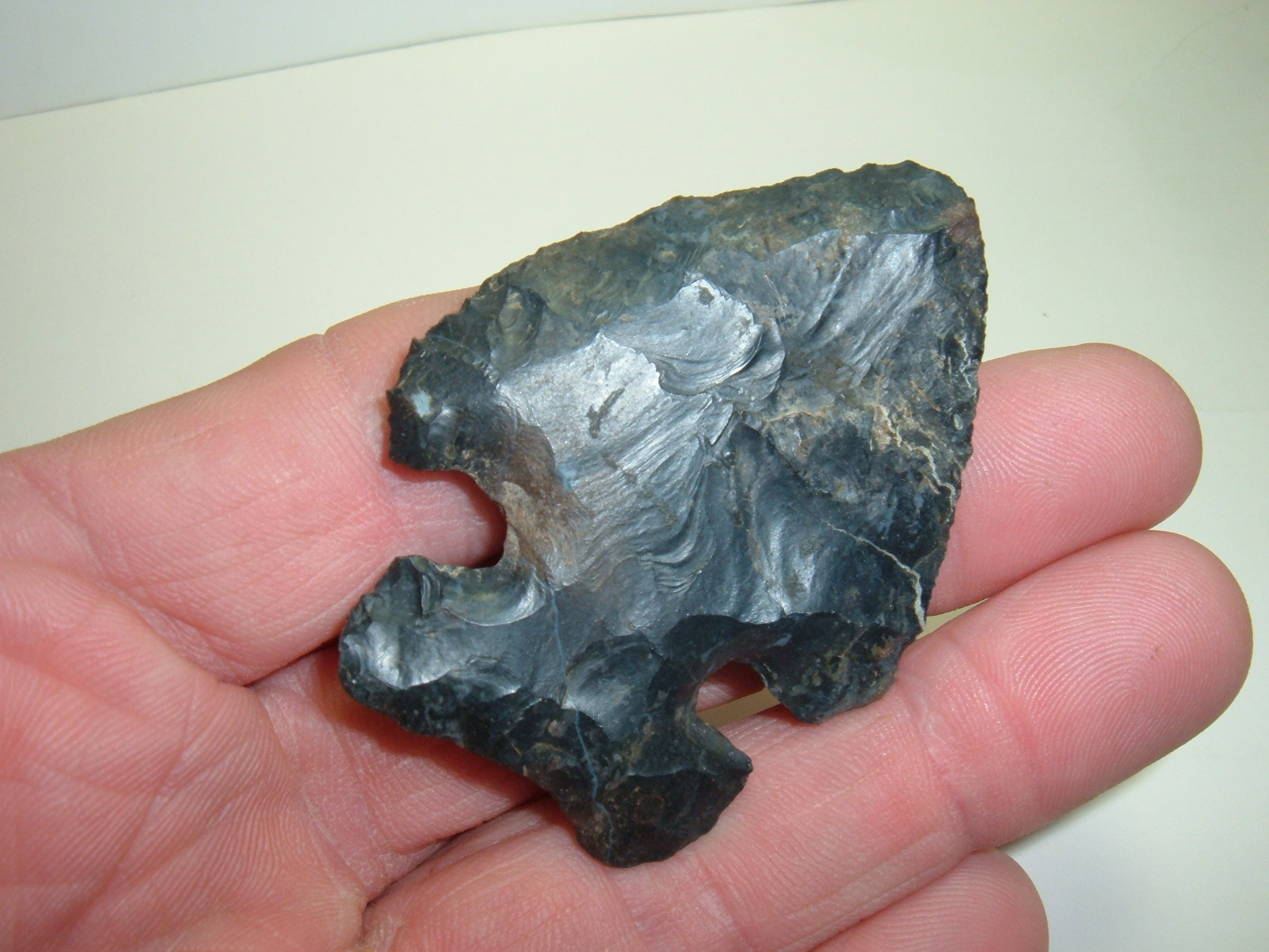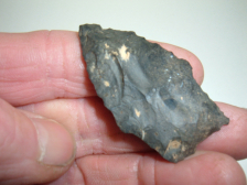 FROM OUR PERSONAL COLLECTIONS COMES THIS OUTSTANDING OHIO THEBES, 2 3/8" AND QUITE WIDE AT 1 7/8"! FOUND IN CRAWFORD CO.OHIO AND MADE OF FINE HIGHLY SOUGHT BLACK COSHOCTON FLINT! EX EARL & GARY MUMAW. HAS REALLY SEVERE BEVEL TO IT ON BOTH SIDES GIVING IT A LITTLE TWIST! HAS ALMOST A ANGELFISH SHAPE TO IT AND ANOTHER FINE PIECE OF OHIO FLINT!