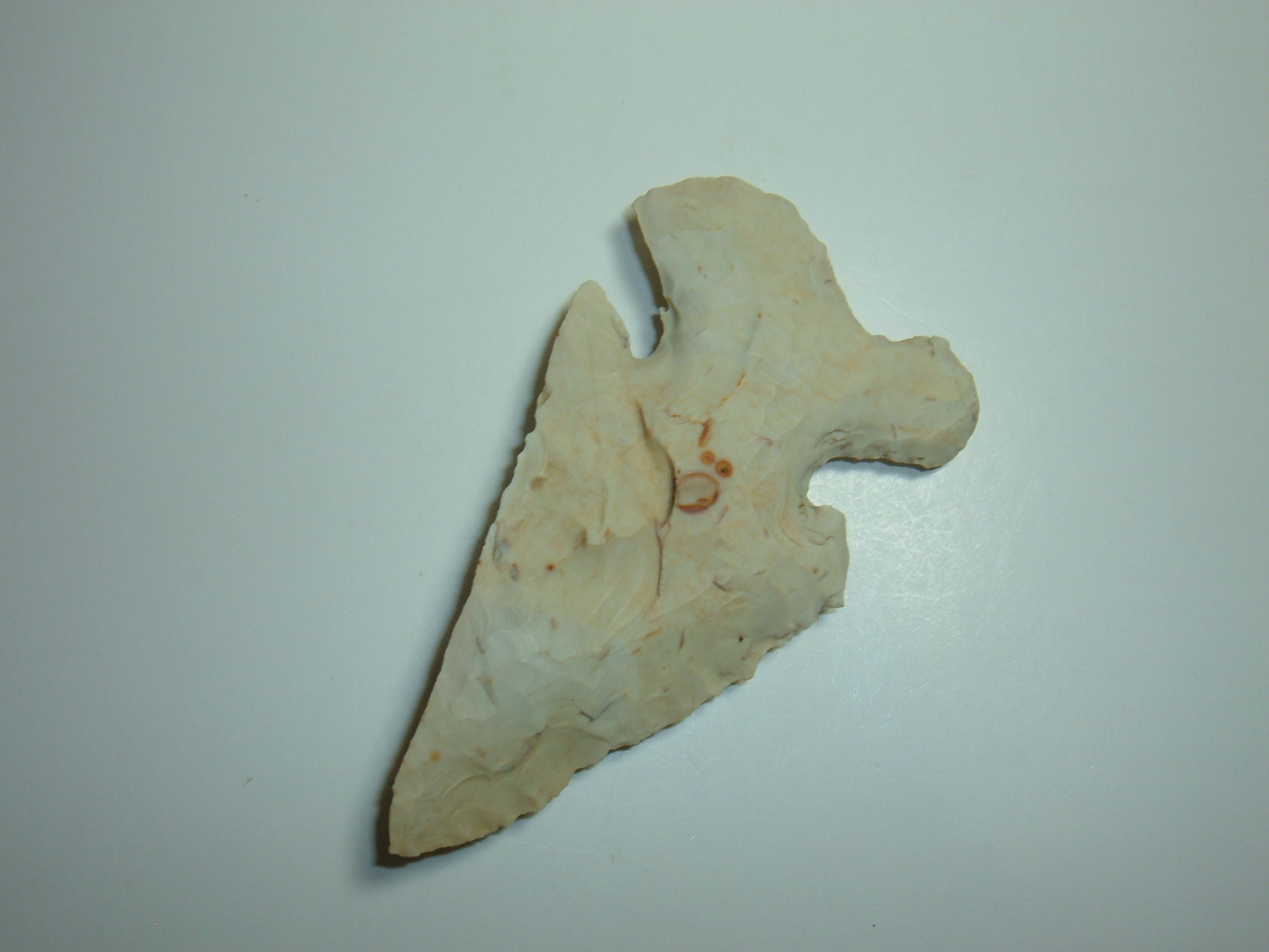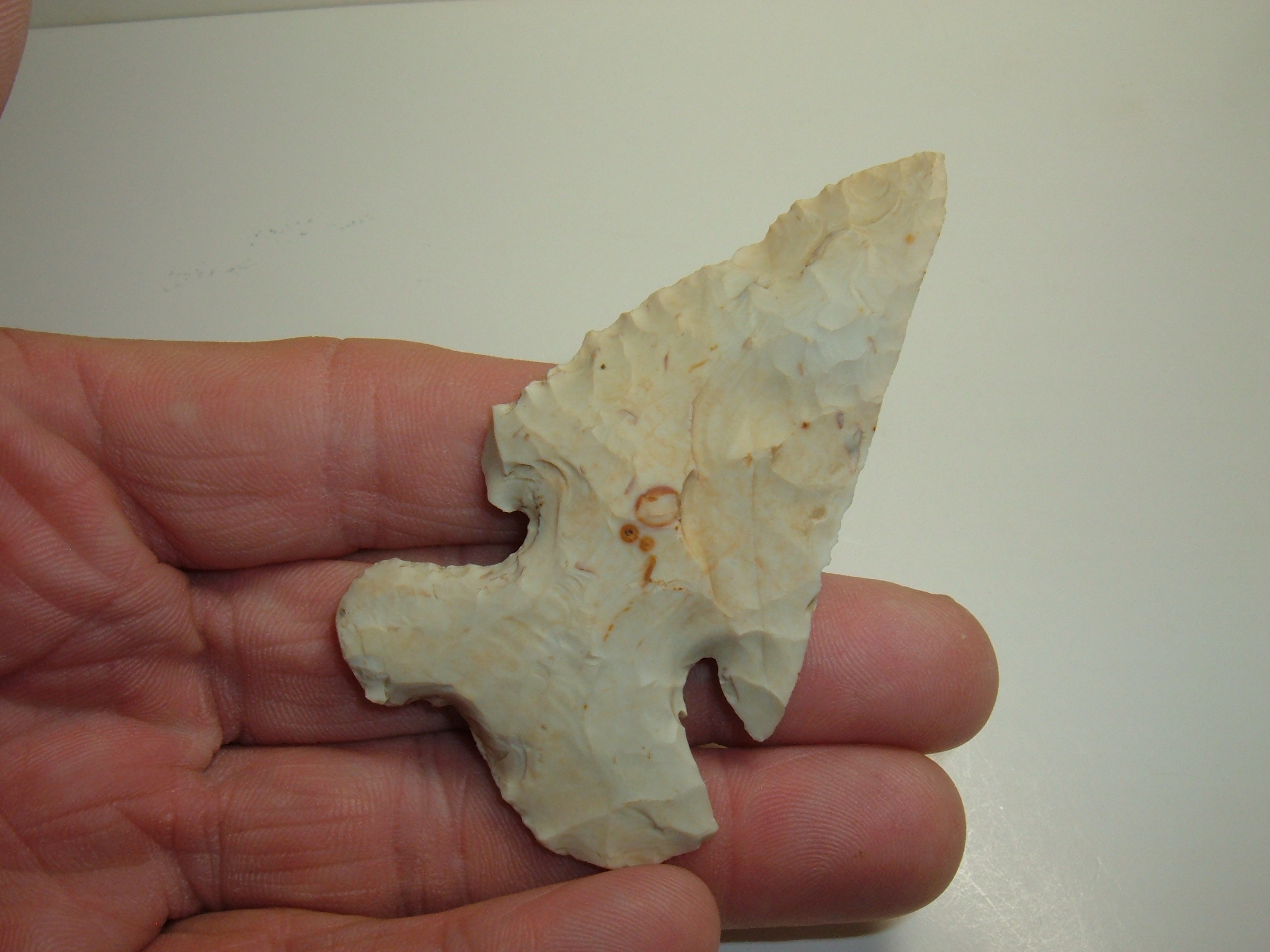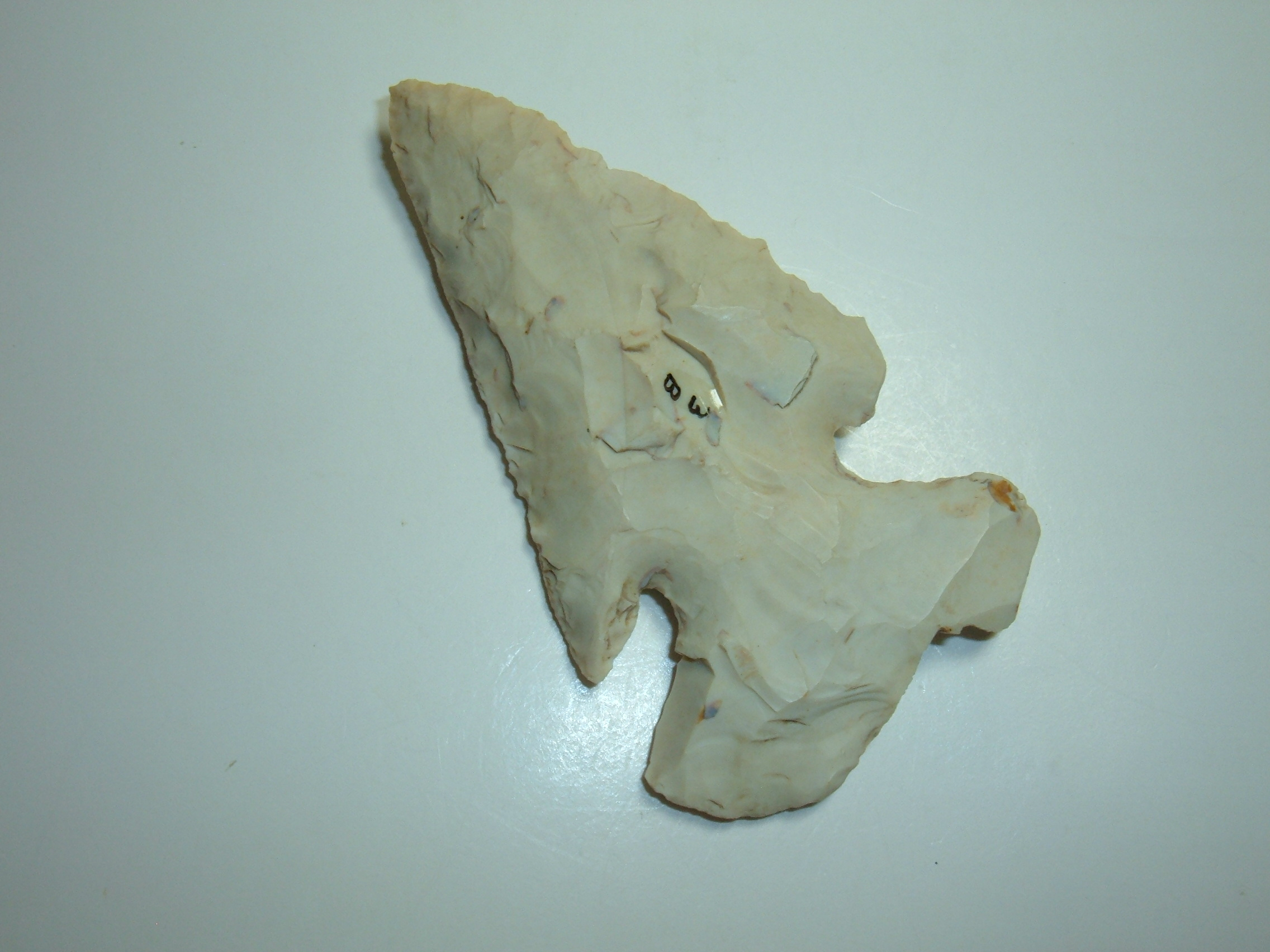 HERE WE HAVE A VERY INTERESTING EXAMPLE OF PREHISTORIC ARTWORK, THIS ARCHAIC DOGLEG BEVEL IN THAT IT WAS MADE RATHER STRANGELY WITH ONE LOBE OF THE BASE MUCH LARGER THAN THE OTHER WITH SOME INTENDED GRINDING IN A FEW PLACES SUCH AS BOTH SIDES OF THE BASE,ONE ON THE BOTTOM AND ONE ABOVE ON THE STEM.ONE EAR AT FIRST GLANCE WOULD SEEM TO HAVE PREHISTORIC DAMAGE BUT UPON CLOSER INSPECTION I DO NOT BELIEVE THIS TO BE THE CASE AS THE STEM ,ON THE SAME SIDE IS GROUND TOO!(SEE PICTURES) BIG RELIC AT 3 1/16" AND FOUND IN KNOX CO.OHIO ,MATERIAL IS CREAM FLINT RIDGE FLINT THIS RELIC HAS BEEN IN OLD COLLECTIONS BEFORE AS EVIDENCED BY CATALOG NUMBERS ON BOTH SIDES. VERY INTERESTING POINT!