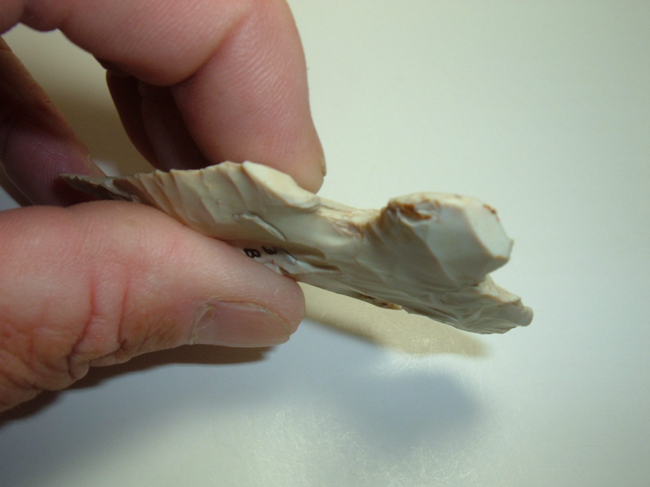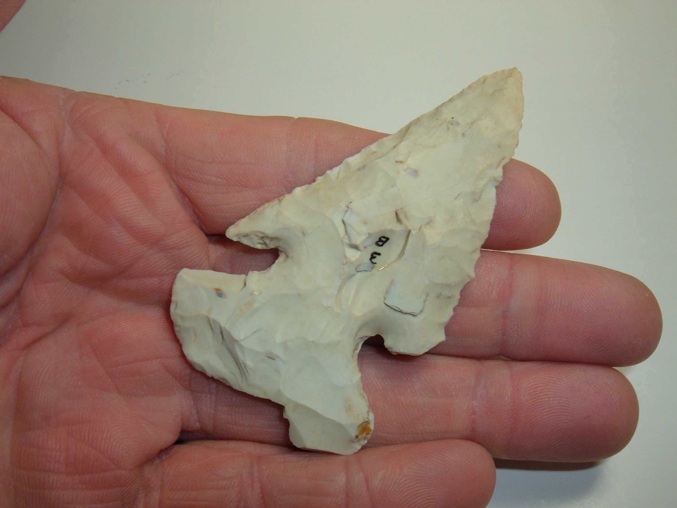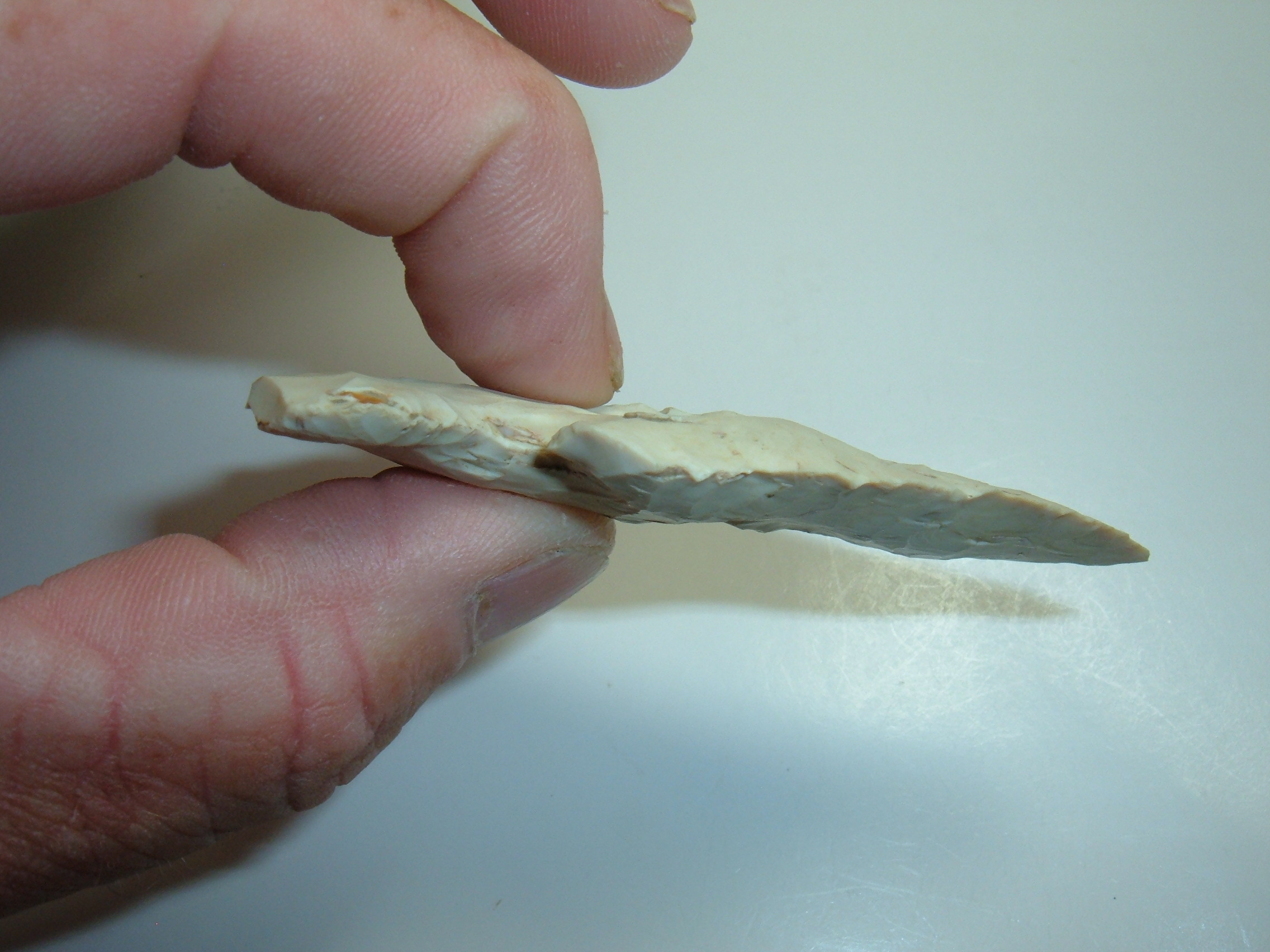 HERE WE HAVE A VERY INTERESTING EXAMPLE OF PREHISTORIC ARTWORK, THIS ARCHAIC DOGLEG BEVEL IN THAT IT WAS MADE RATHER STRANGELY WITH ONE LOBE OF THE BASE MUCH LARGER THAN THE OTHER WITH SOME INTENDED GRINDING IN A FEW PLACES SUCH AS BOTH SIDES OF THE BASE,ONE ON THE BOTTOM AND ONE ABOVE ON THE STEM.ONE EAR AT FIRST GLANCE WOULD SEEM TO HAVE PREHISTORIC DAMAGE BUT UPON CLOSER INSPECTION I DO NOT BELIEVE THIS TO BE THE CASE AS THE STEM ,ON THE SAME SIDE IS GROUND TOO!(SEE PICTURES) BIG RELIC AT 3 1/16" AND FOUND IN KNOX CO.OHIO ,MATERIAL IS CREAM FLINT RIDGE FLINT THIS RELIC HAS BEEN IN OLD COLLECTIONS BEFORE AS EVIDENCED BY CATALOG NUMBERS ON BOTH SIDES. VERY INTERESTING POINT!