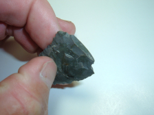 HERE IS A FINE EXAMPLE OF THE FRACTURED BASE TYPE, 1 7/8" AND FOUND IN PERRY CO.OHIO BY BRYAN DONALDSON, A WELL KNOWN OHIO RELIC COLLECTOR WHO AMASSED A HUGE COLLECTION OF QUALITY FLINT ALONG WITH HIS FATHER,GERALD! MATERIAL IS COSHOCTON BLACK FLINT BUT NOTE THE DELICATE FLAKING ON BOTH SIDES OF THIS POINT AS WELL AS THE WAFER THIN THICKNESS! VERY VERY NICE EXAMPLE OF A VERY DESIRABLE POINT TYPE!