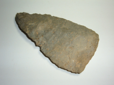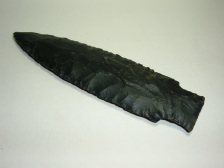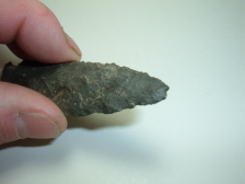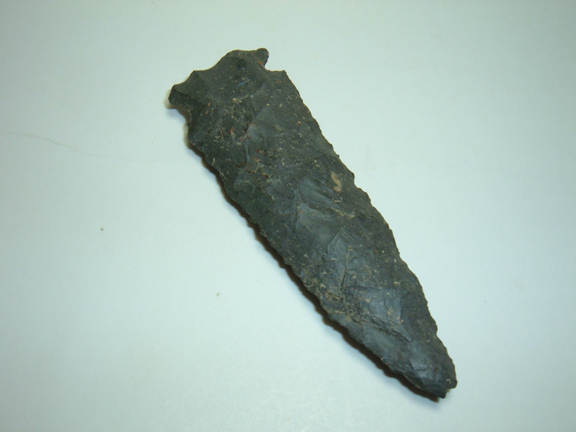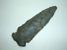 HERE WE HAVE ANOTHER NICE MEADOWOOD POINT FROM OUR OWN PERSONAL COLLECTIONS ,THIS ONE IS 3 1/8" FROM KNOX CO.OHIOAND IS EX JIM BARKER! MATERIAL IS BEAUTIFUL BLACK COSHOCTON FLINT.THIS POINT APPERAS TO SHOW A TINY BIT OF ANCIENT IMPACT DAMAGE AT THE TIP,MAY HAVE BEEN ANCIENTLY RECHIPPED AS THE TIP HAS DEPOSITS SEEN ON THE WHOLE POINT! NICE, GOOD SIZE EXAMPLE OF THE TYPE!