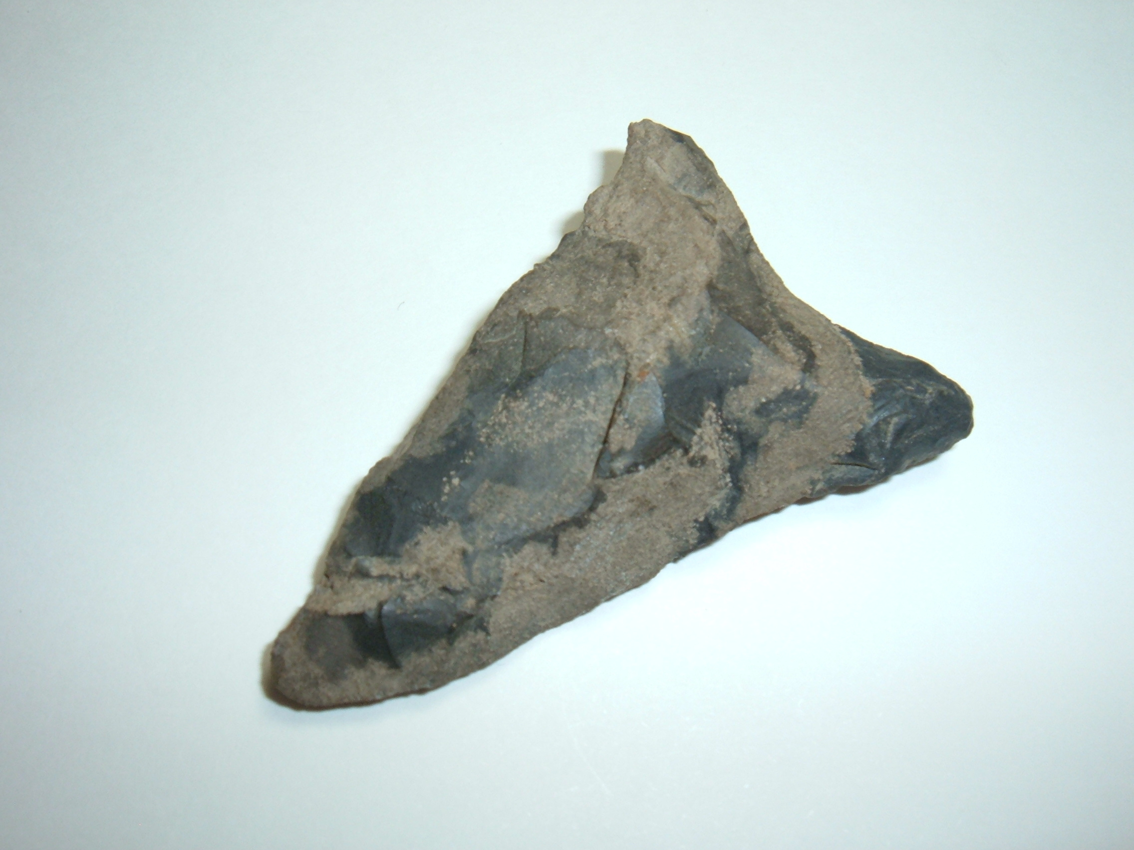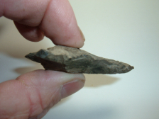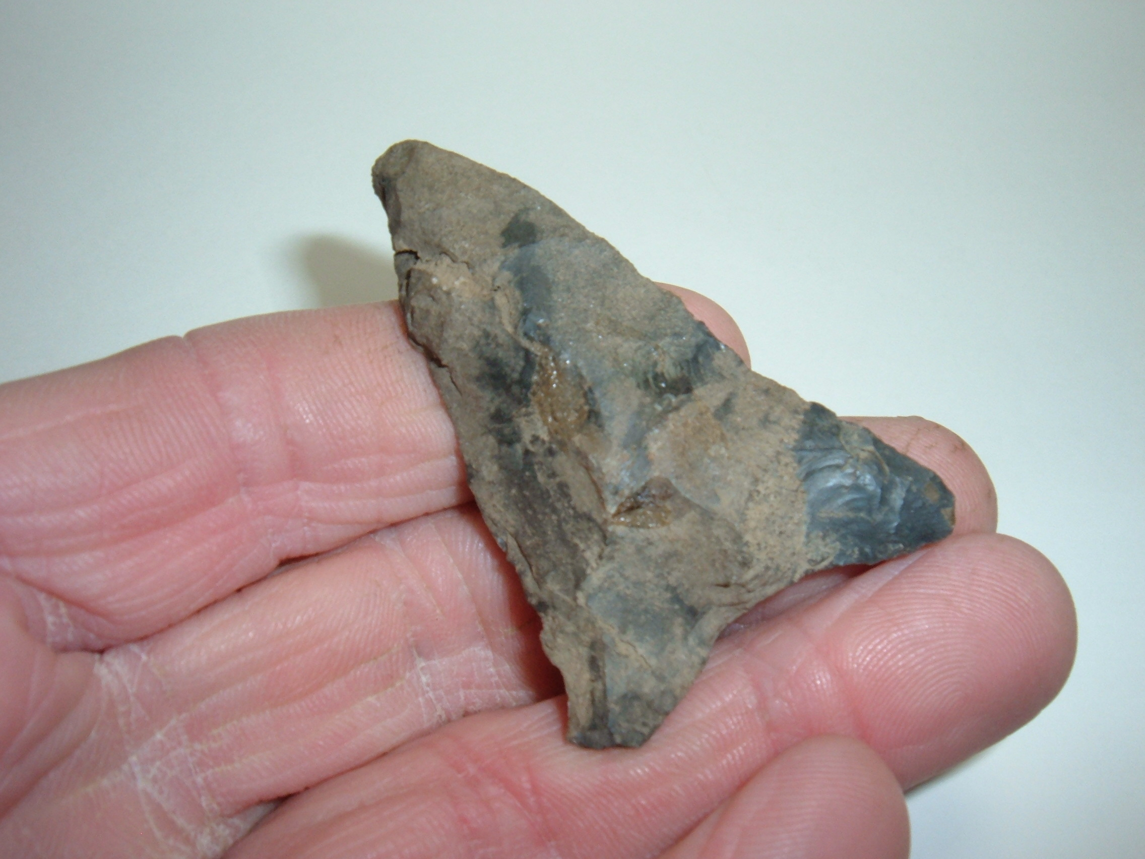THIS IS ONE BIG LEVANNA TRIANGLE , 2 3/8" AND FOUND IN OTSEGO CO, NEW YORK! MATERIAL IS ONANDAGA CHERT AND QUITE IMPRESSIVE! IT HAS A TINY BIT OF ANCIENT DAMAGE TO THE ONE EAR OTHERWISE A VERY LARGE, NICE POINT!
