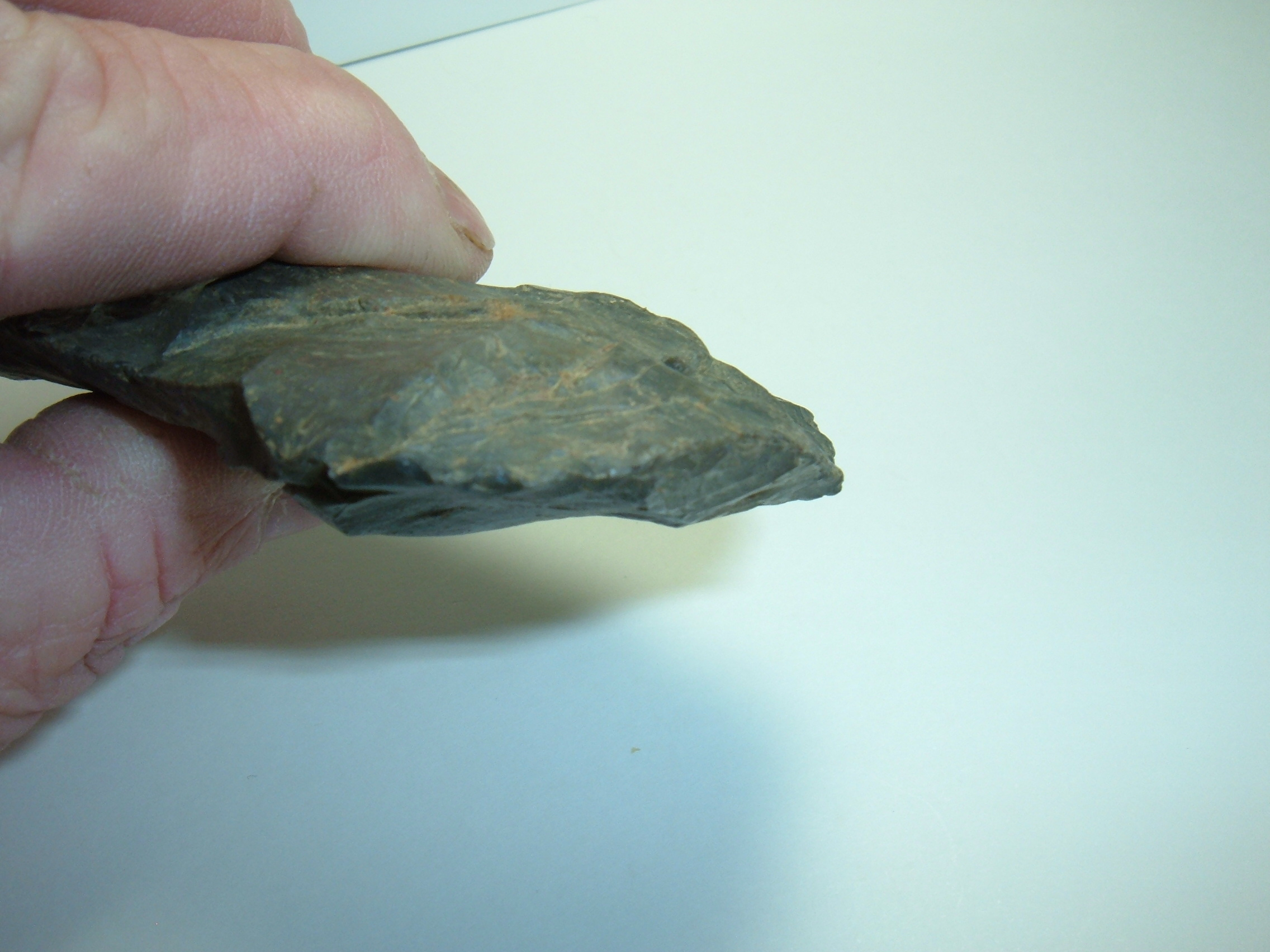 THIS SUPER FLINT CELT, ,3 3/4" WAS FOUND ON THE BORDER OF ASHLAND AND MEDINA COUNTIES OHIO AND IS MADE FROM FINE UPPER MERCER FLINT! VERY WELL CONSTRUCTED WITH A SUPER BIT END,EXCELLENT FLINT CELT
