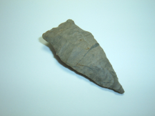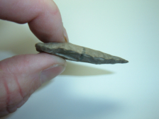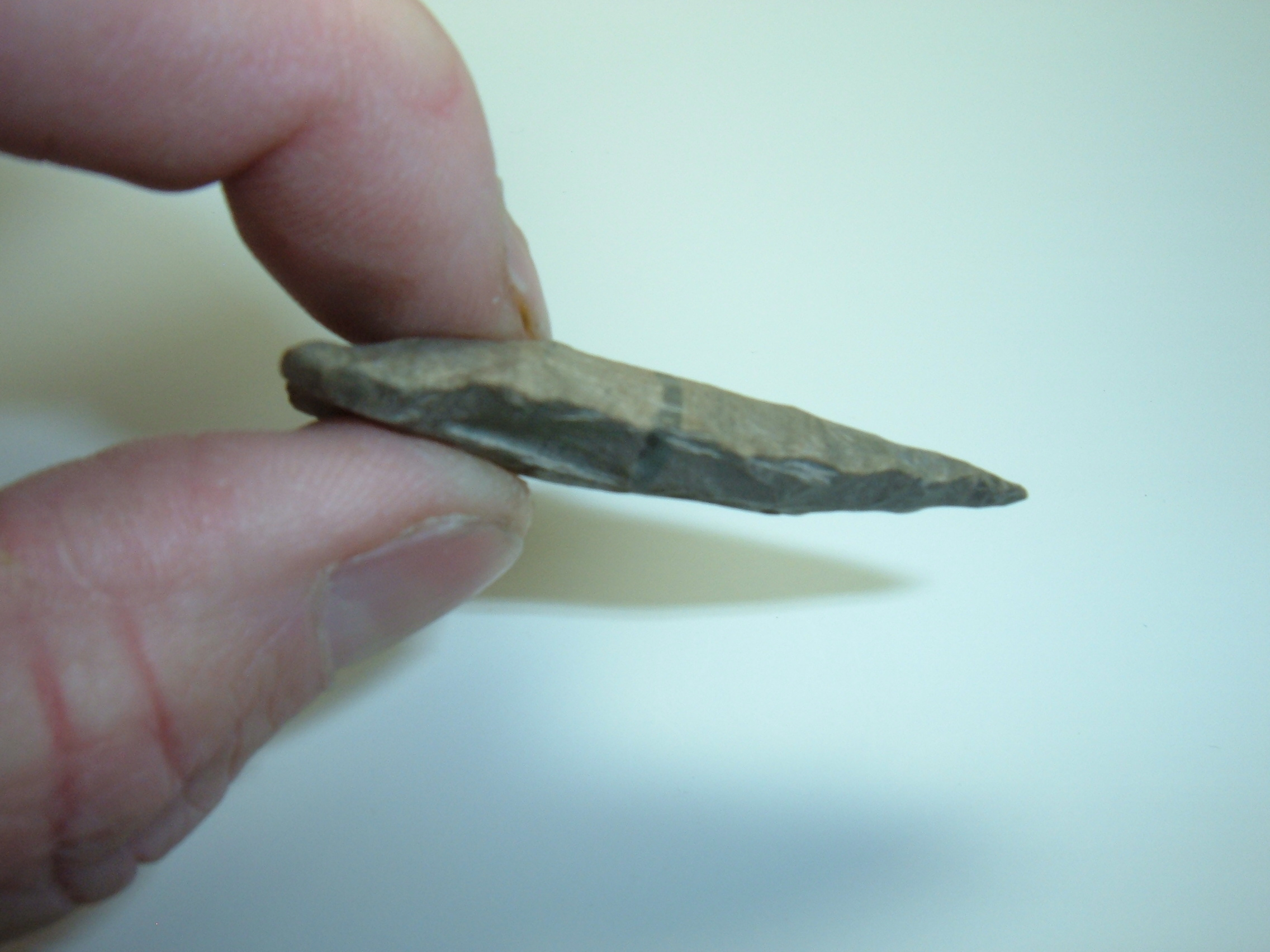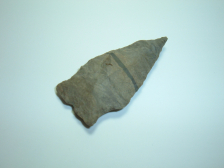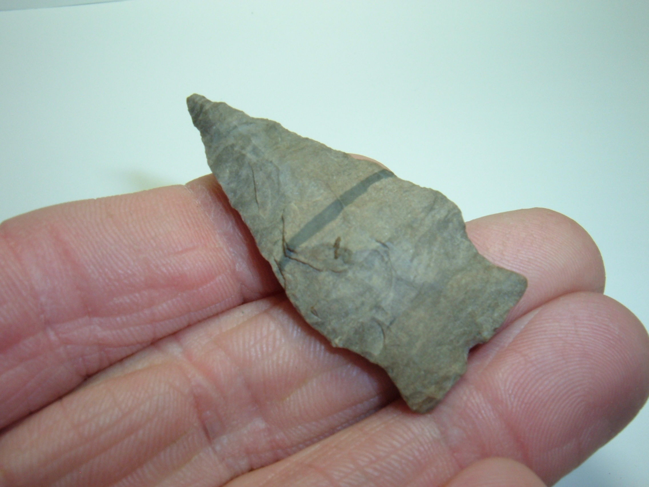 THIS EXAMPLE OF AN ARCHAIC STEMMED POINT IS EXCEPTIONAL IN THAT IT IS MADE OF UNCOMMONLY ENCOUNTERED COSHOCTON NELLIE,IT IS 1 7/8" AND HAS AN UNUSUAL DARK LINE RUNNING HORIZONTALLY ACROSS THE MIDSECTION! THIS POINT IS EX BRYAN DONALDSON, WHO,TOGETHER WITH HIS FATHER ,GERALD ASSEMBLED A HUGE COLLECTION OF QUALITY FLINT,VERY NICE LOOKING RELIC!