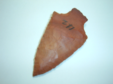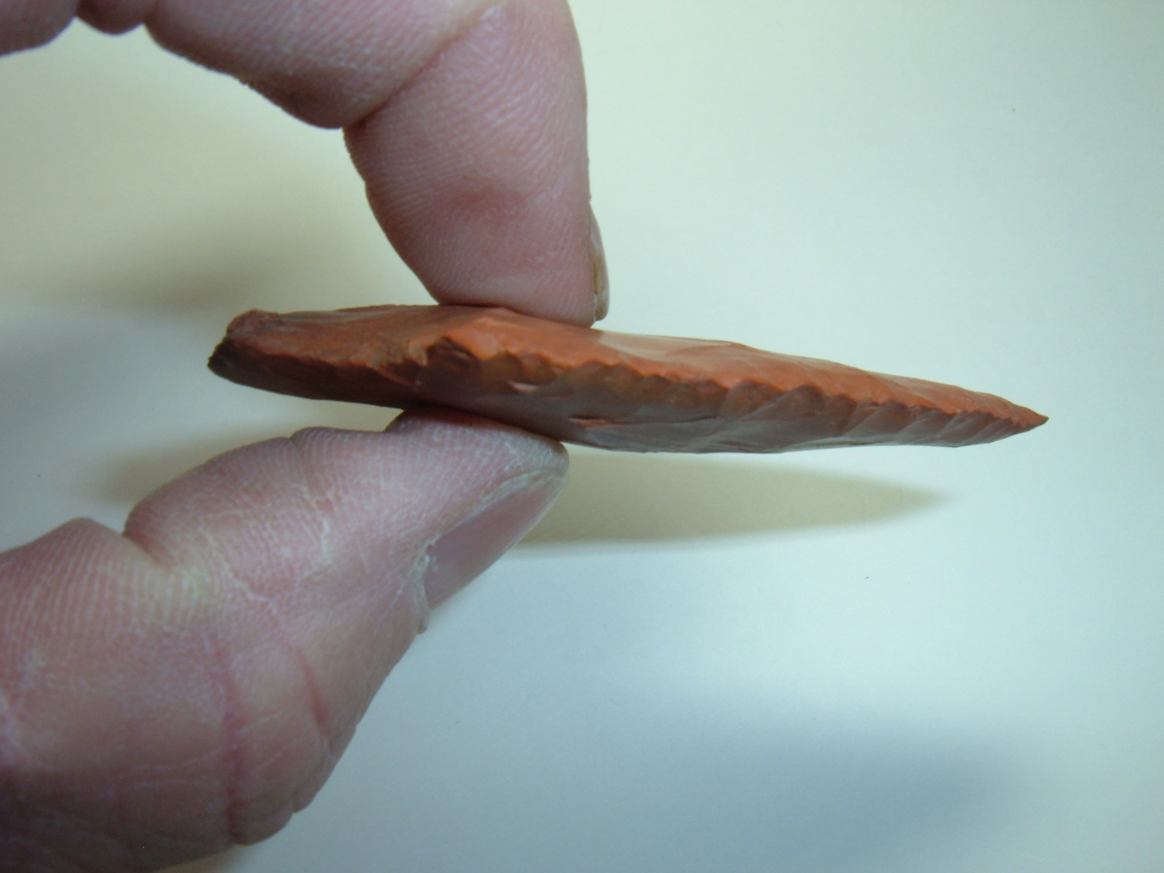 THIS FABULOUS REDDISH/ORANGE PICKWICK POINT IS A FABULOUS RELIC! THIS BEAUTIFUL POINT MEASURES 2 1.2" AND WAS FOUND IN NORTHERN MISSISSIPPI BY NORMAN BLEULER IN THE 1960'S! MATERIAL IS FABULOUS ORANGE RED JASPER WITH WICKED SERRATIONS ANS SECONDARY FLAKING,KILLER KILLER!!!