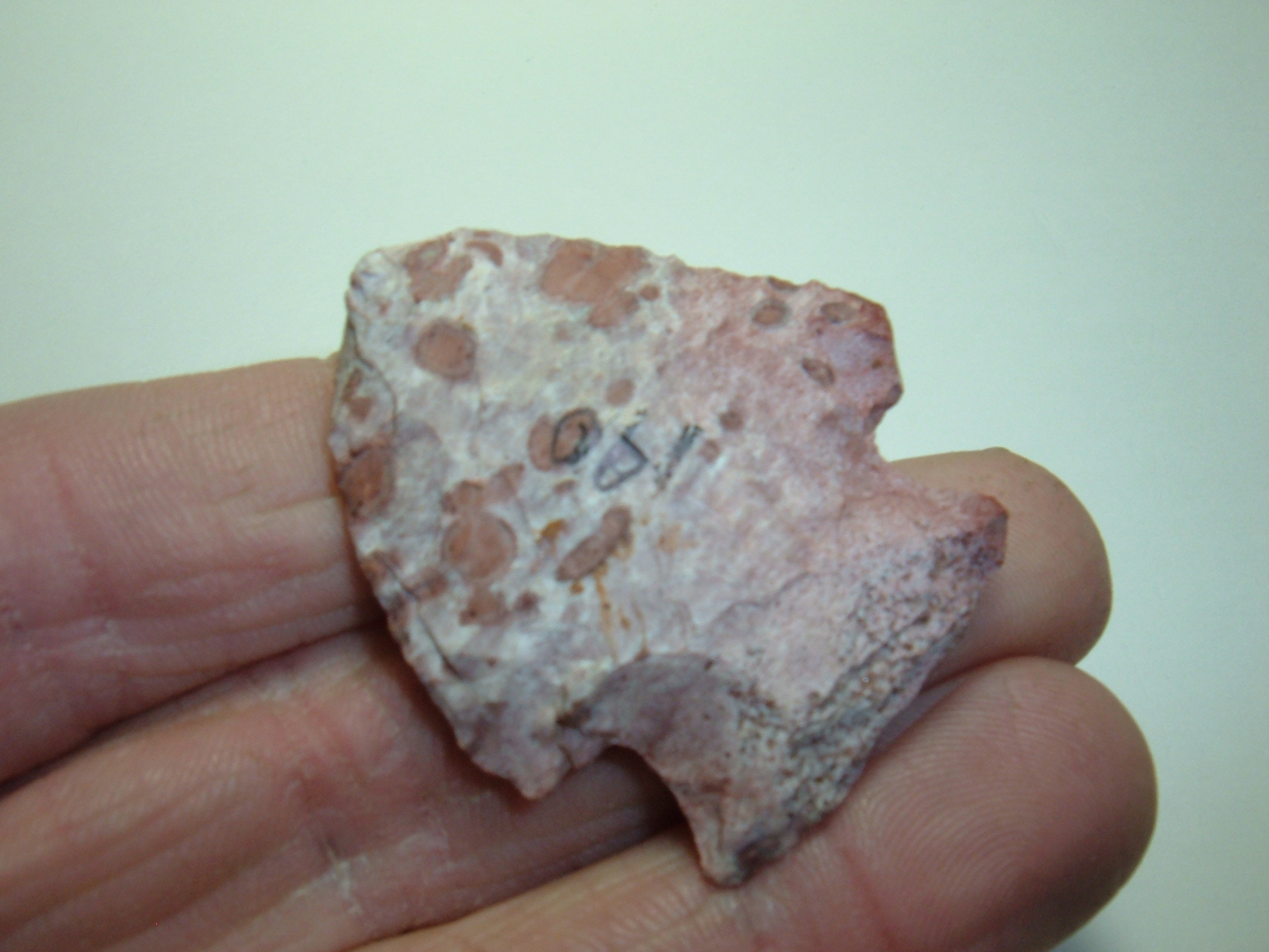 FOR THE LOVER OF COLOR THIS TEAS STERMMED POINT IS SURE TO PLEASE ! 1 11/16" WITH GEORGEOUS PINKS AND REDS THIS POINT WAS FOUND IN THE 1960'S BY NORMAN BLEULER ON THE TEXAS PANHANDLE. . I AM NOT SURE OF THE MATERIAL BUT WITH THIS COLOR IT IS A SHOW STOPPER!!!