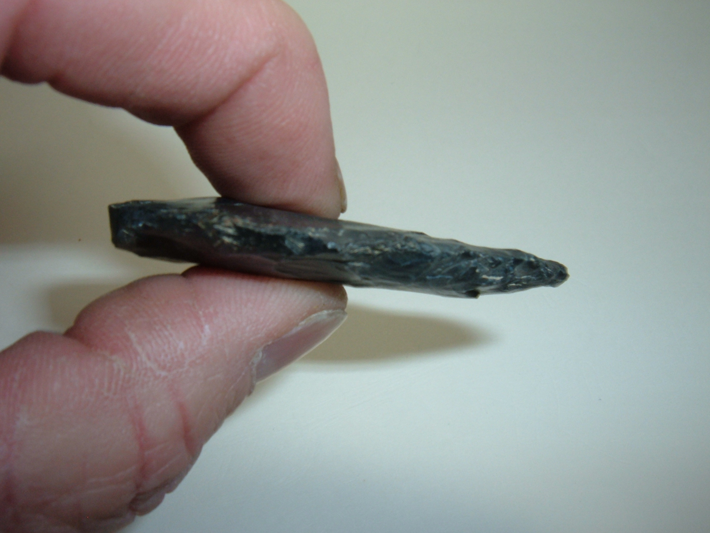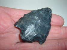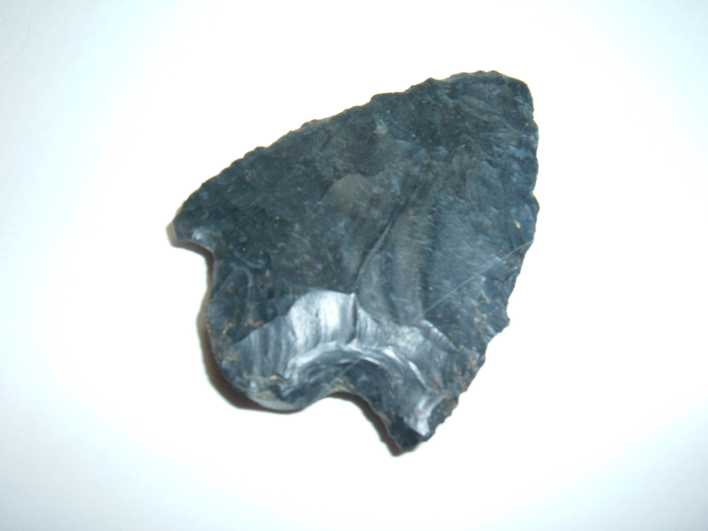 FROM OUR PERSONAL COLLECTIONS COMES THIS VERY SWEET KIRK SNAP BASE POINT. ALSO CALLED FRACTURED BASE POINTS THIS FINE EXAMPLE WAS FOUND IN TUSCAWARAS CO.OHIO BY JIM BARKER AND IS 2 1/8". MADE FROM FINE BLACK COSHOCTON ,EXCELLENT REPRESENTATIVE OF THE TYPE!