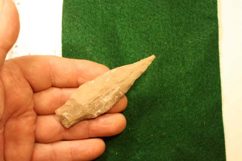 The artifact is about 3 1/2 " long and appears to be heat treated Edward's Chert. The stem is beveled on one side of the face and it appears to be ground.