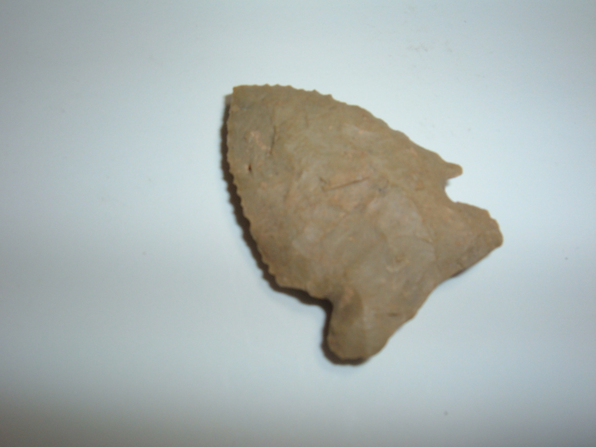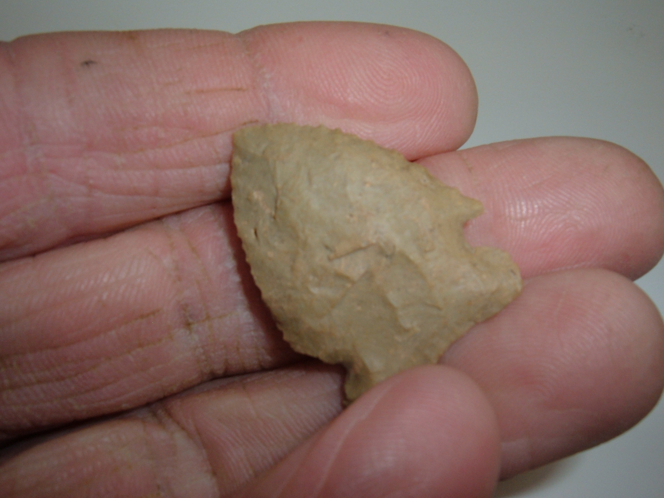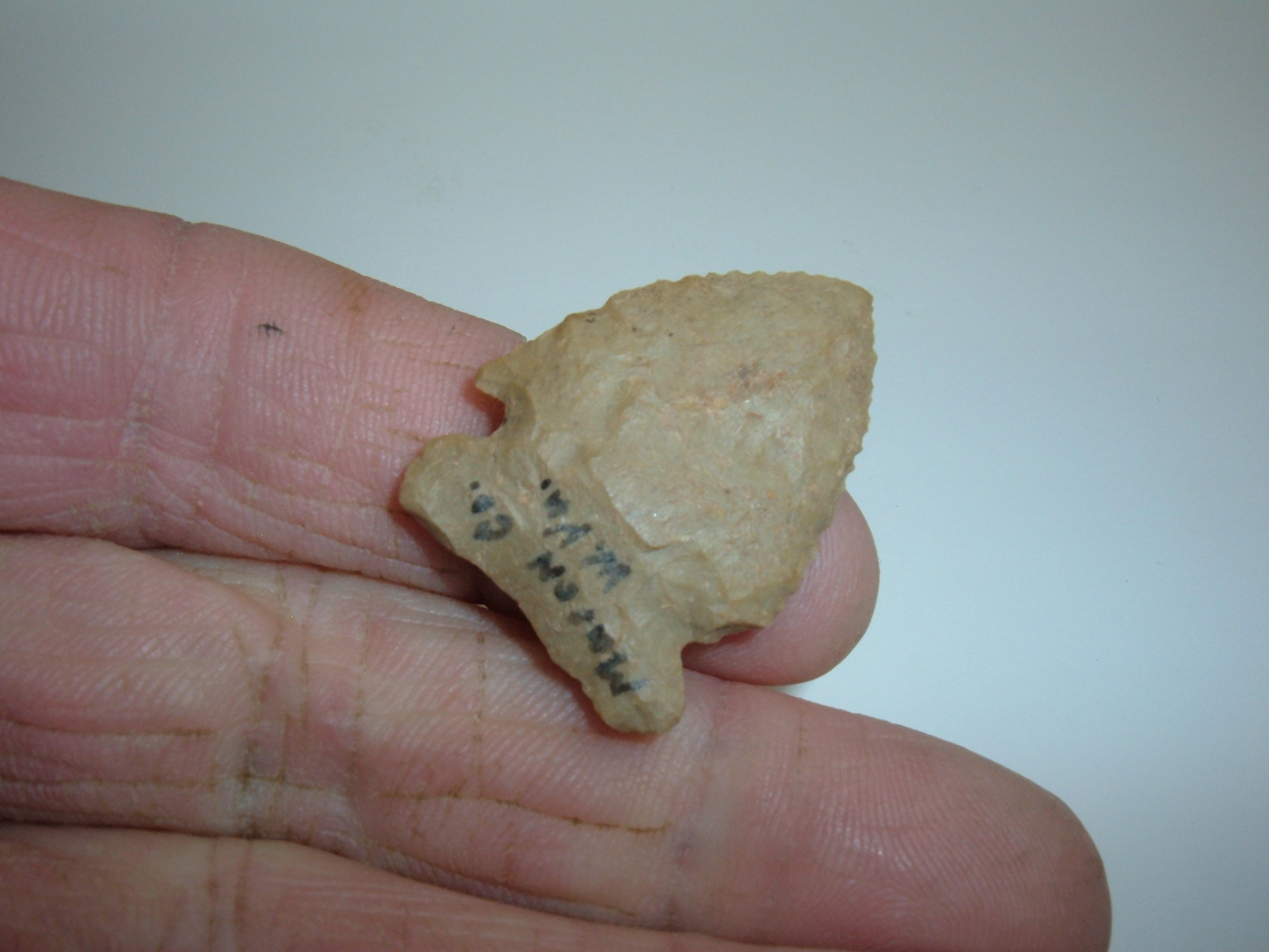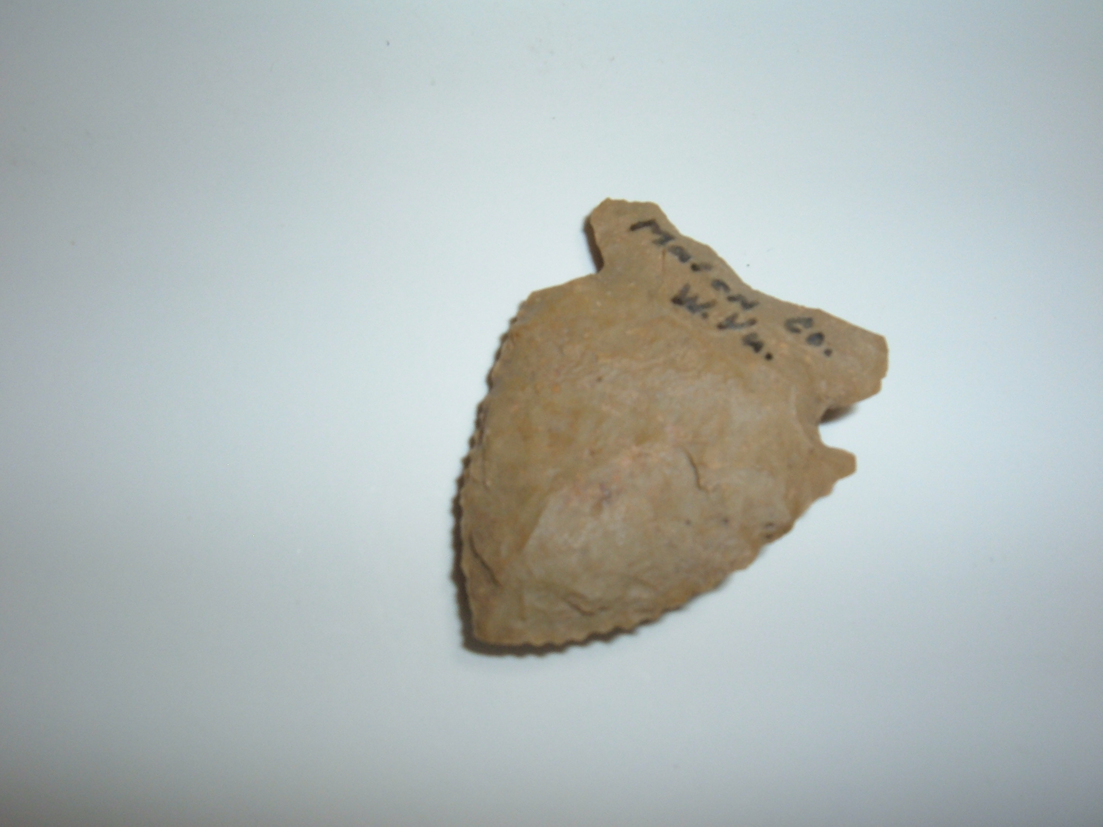 HERE IS A NICE LITTLE CORNER NOTCH , 1 1/4" FOUND IN MASON CO.WEST VIRGINIA AND CAME OUT OF THE WELL KNOWN CHARLIE MAKEAN COLLECTION! DISPLAYS VERY NICE SERRATIONS HAS A LITTLE CULTIVATION DAMAGE TO ONE EAR AND POSSIBLY CARTER CAVE FLINT,NICE CORNER NOTCH WITH EXCELLENT COLLECTOR HISTORY!