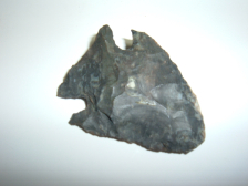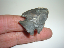 FROM OUR PERSONAL COLLECTIONS COMES THIS FINE INTRUSIVE MOUND POINT, 1 1/2" AND FOUND IN KNOX CO.OHIO,MATERIAL IS A MOTTLED BLUE/BLACK COSHOCTON FLINT AND A NICE EXAMPLE OF THE TYPE!