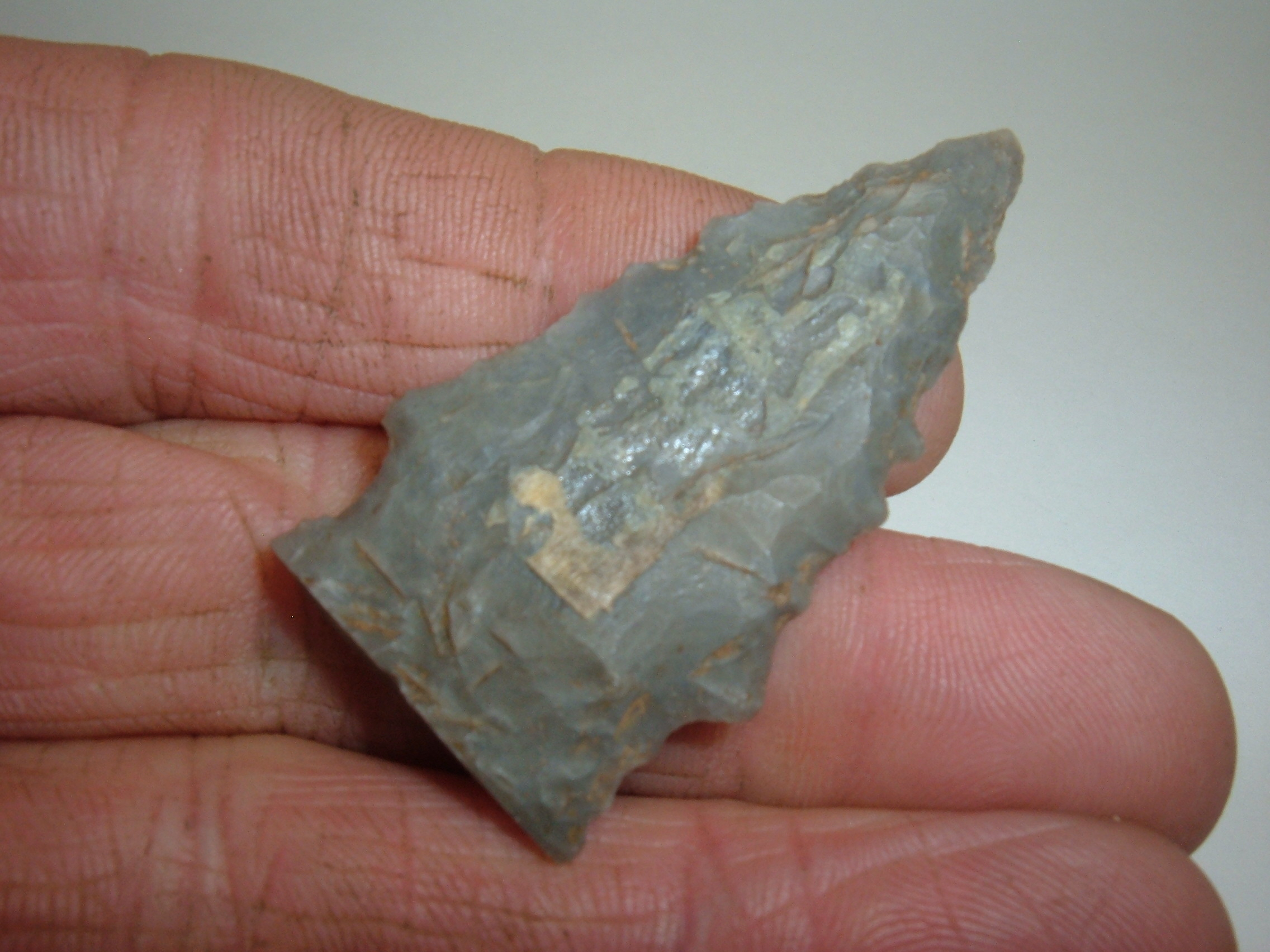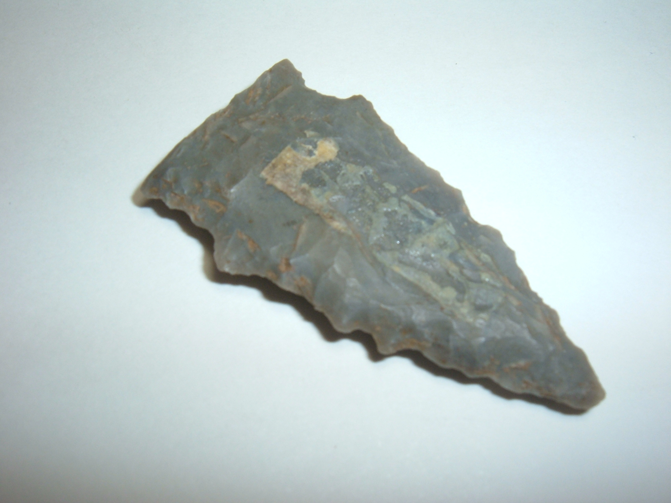 HERE WE HAVE A FINE THIN ARCHAIC SERRATED POINT 1 3/4" FOUND IN LICKING CO.OHIO AND MADE FROM INDIANA HORNSTONE! VERY NICE RELIC!!!