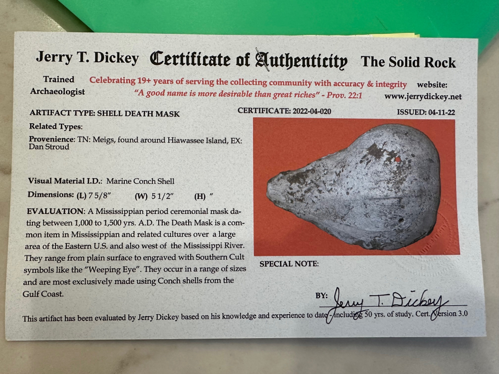 This is a modified Chickamauga Creek style Shell Mask and really phenomenal because of the lifesaver eyes - hairline and raised mouth.