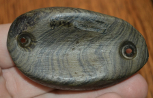 This very well made green and black hardstone plummet/ Charmstone was found in Kings Co, California near the Tulare Lake site in the 1930's. This piece measures 3.5 inches long and is 1.3/8 inches wide across the body of the piece. This rare relic is made from a great piece of hardstone and is really well made overall. This piece was first collected by Byron Knoblcok of Quincy, Illinois and then traveled to Wisconsin where it was added to the Ludwick collection. The Ludwick collection moved to California where it was purchased in the 1970's by Byron Anderson of El Cajun Co, California. Ex Mitch Lewis.This piece is very well made and has great provenance history.