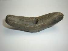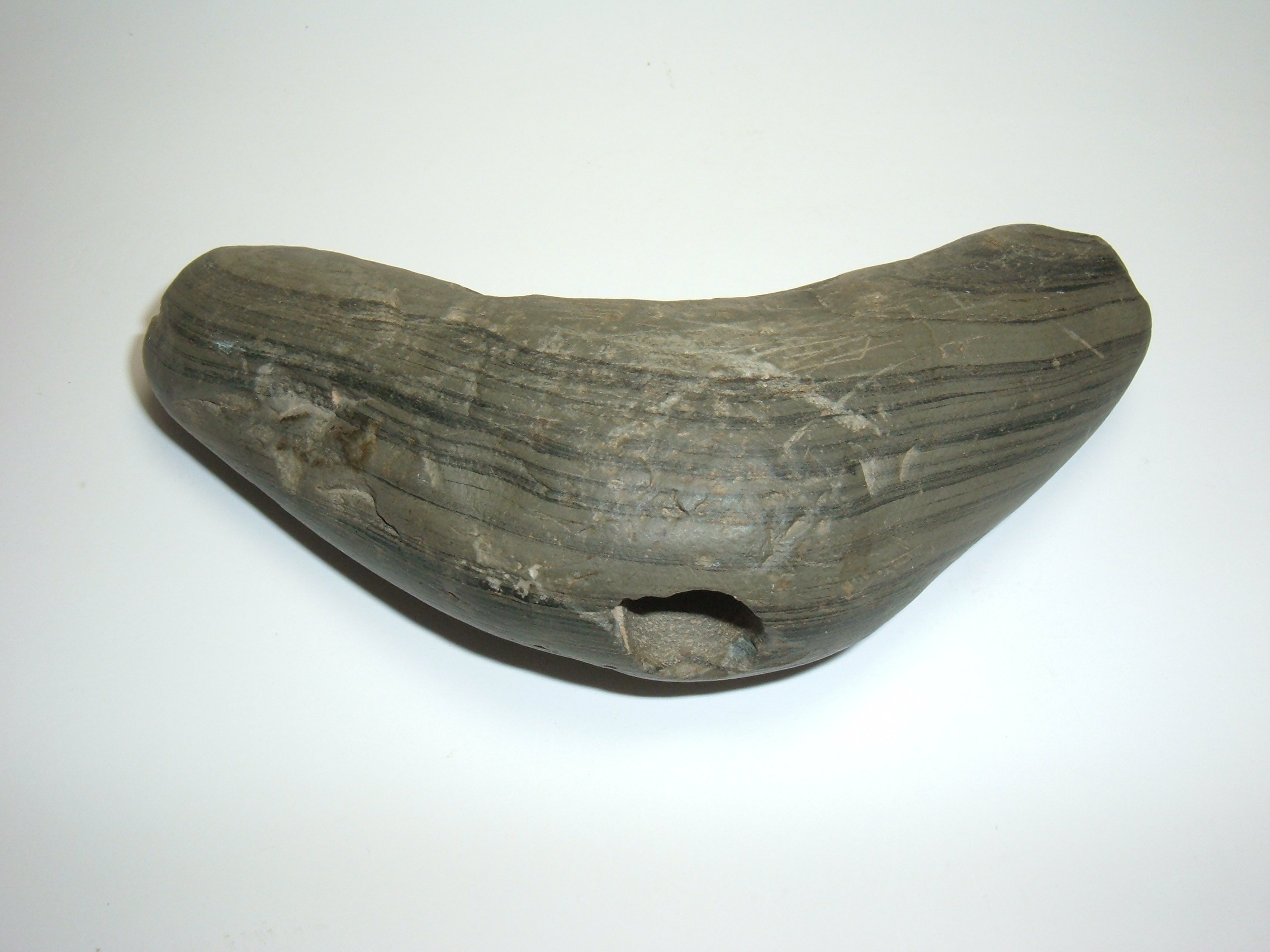 HERE WE OFFER A VERY NICE EXAMPLE OF A VERY HIGHLY COLLECTED SLATE TYPE, THE CRESCENT BANNERSTONE! FULLY DRILLED 4 1/2" AND FOUND IN DEFIANCE CO.OHIO IT WAS FOUND BY DON STARK IN HIS GARDEN IN THE SPRING OF 1998 SOUTH OF EDGARTON,OHIO! IT IS EX ROBERT SCANLEN ALSO EX.RICHARD HURLEY AND IS MADE FROM NICE BANDED SLATE. NOT AS ORNATE AS SOME BUT A SUPER EXAMPLE AND NOT IN THE $8-10,000 RANGE EITHER!