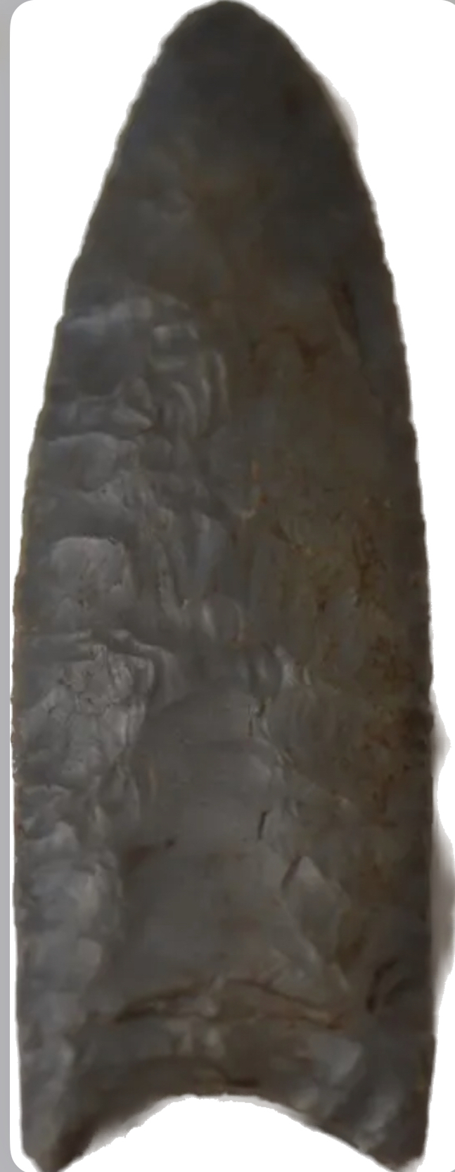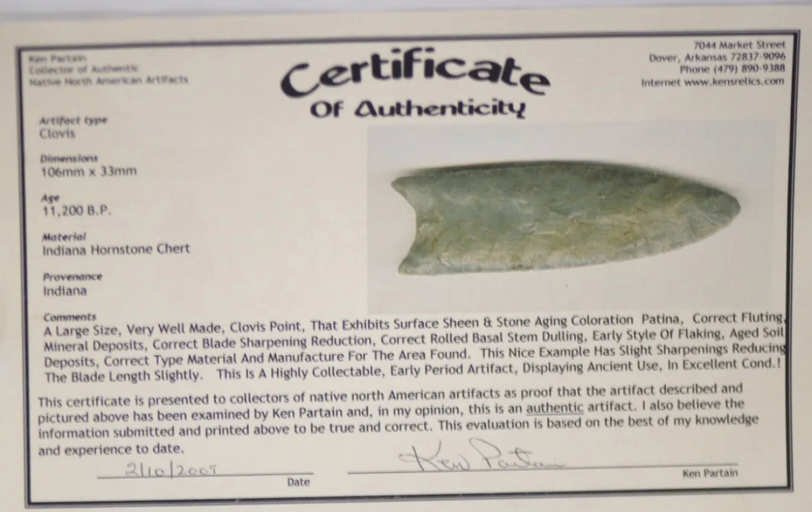This Large Outstanding Paleo Clovis Point was found in Benton County Indiana on 08/21/2002 by Dave Hendershot. It is made of Legendary Indiana Baby Blue Hornstone. It measures 4-3/16 long by 1-5/16 wide. This Clovis point is excellent from the beautiful material to the quality craftsmanship.