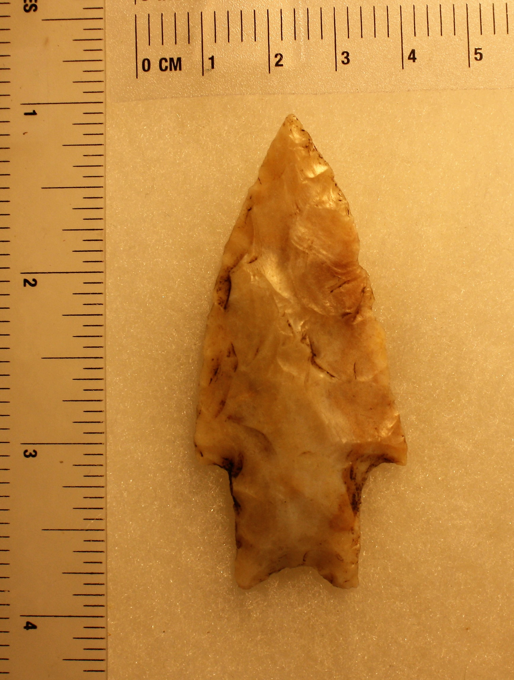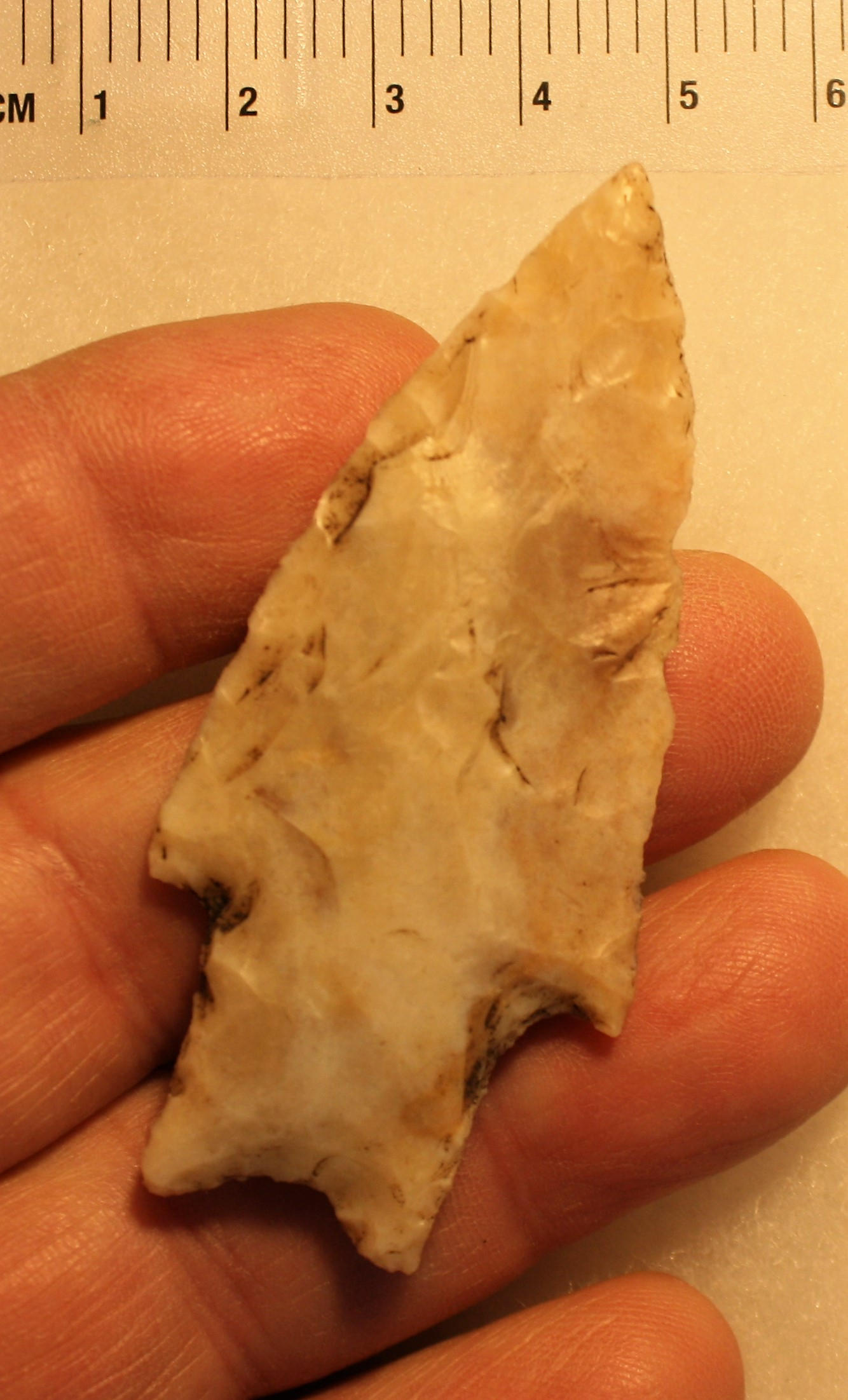 This is a good size dart point made out of an unknown material. It is creamy white with tan hues.