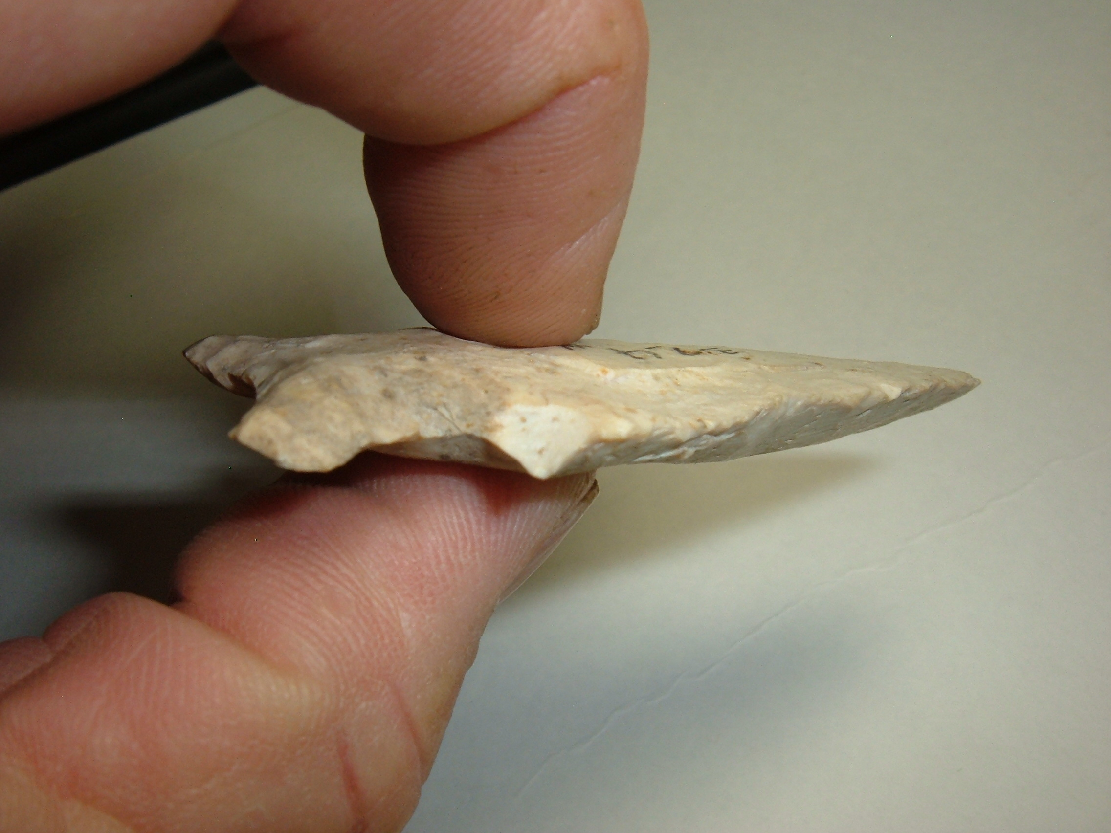 HERE WE HAVE A VERY NIC EBEVELED HARDIN FROM ILLINOIS COMING IN AT 2 5/8" AND MADE FROM BURLINGTON CHERT! FOUND BY NORMAN BLEULER IN THE 1960'S THIS RELIC WOULD BE QUITE A BIT HIGHER IF NOT FOR A LITTLE DING TO THE ONE EAR,SIMPLY A VERY NICE POINT WITH MINOR EAR DAMAGE!