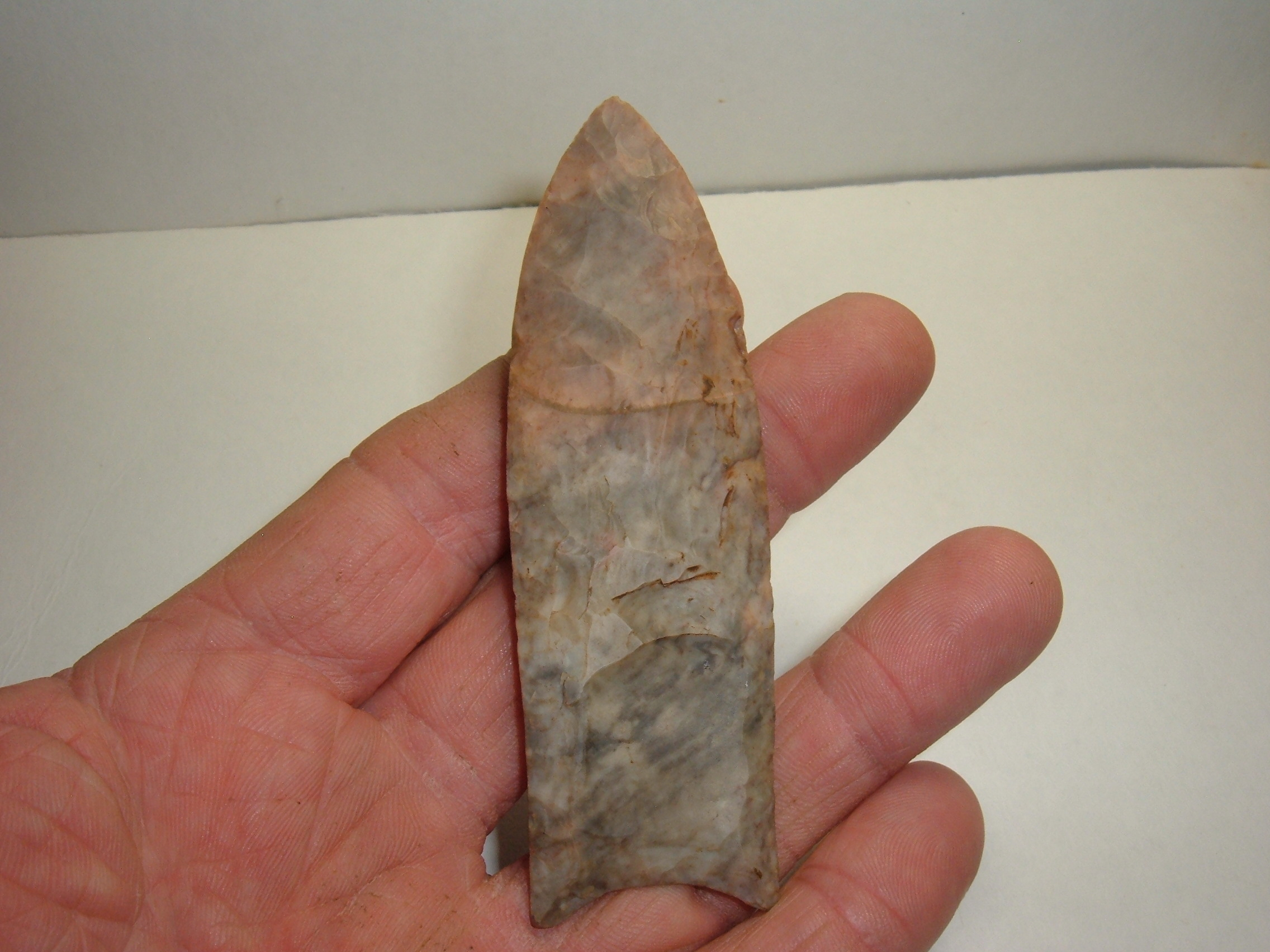 THIS INCREDIBLE OHIO FLUTED CLOVIS IS TRULY TOP OF THER GAME AND EXCEPTIONALLY HIGH GRADE! FOUND IN MORGAN CO.OHIO THIS SUPER RELIC IS EX LENHART AND IS PICTURED IN A OHIO ARCHEOLOGICAL JOURNAL FROM THE 1950'S! IT COMES IN AT A VERY NICE 4" AND HAS A LOT OF PINKISH HUES TO THE FLINT RIDGE FLINT THAT IT WAS MADE FROM!