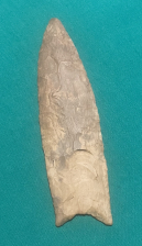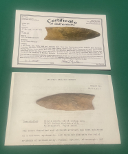 A very large fluted Clovis found in Butler County Kentucky. This extraordinary Clovis is made from a high grade Muldraugh chert that is mottled with a rich brown and light tan color throughout. This beautiful chert comes from the Fort Payne formation. It measures an impressive 4 &7/8” in length X 1 & 3/8”in width. It has been in many well respected collections including Charles West. It’s not often that you will find an authentic unaltered Clovis of this size on the market. This one has an outstanding pedigree and provenance that is detailed on the Calvin Howard and Ken Partain COA’s