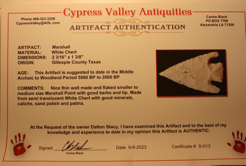 This Marshall is made of off white Edwards Chert with a whitish patina. It is a gorgeous artifact for sure.