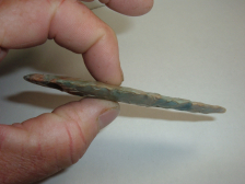 ANYONE WHO COLLECTS POINTS WILL TELL YOU THAT ABOVE ALL THAT COLOR IS KING! IF THAT IS TRUE THIS DOVETAIL MUST BE THE KING OF THE GREEN DOVES! FOUND IN PUTNAM CO.OHIO THIS BIG 3 15/16" POINT IS EX DICK COULTER WHO NEEDS LITTLE INTRODUCTION AMONG OHIO RELIC COLLECTORS!INCREDIBLE FLAKING TO THIS VERY VERY HIGH GRADE POINT!THE COLOR IS UNBELIEVEABLE HAVING A LOAD OF GREEN, ORANGE AND EVEN A BIT OF BLUE TO THE EXOTIC FLINT RIDGE FLINT !