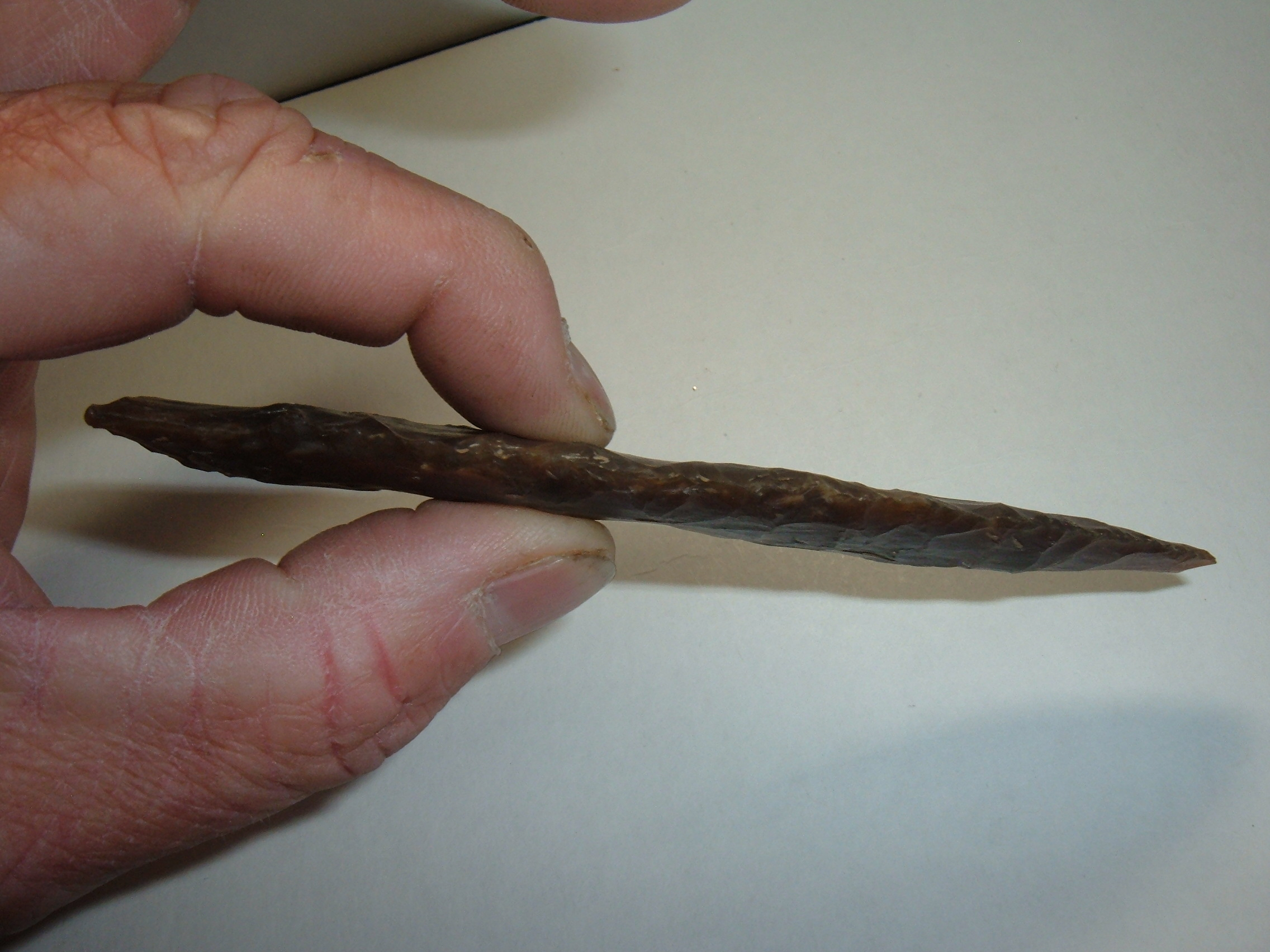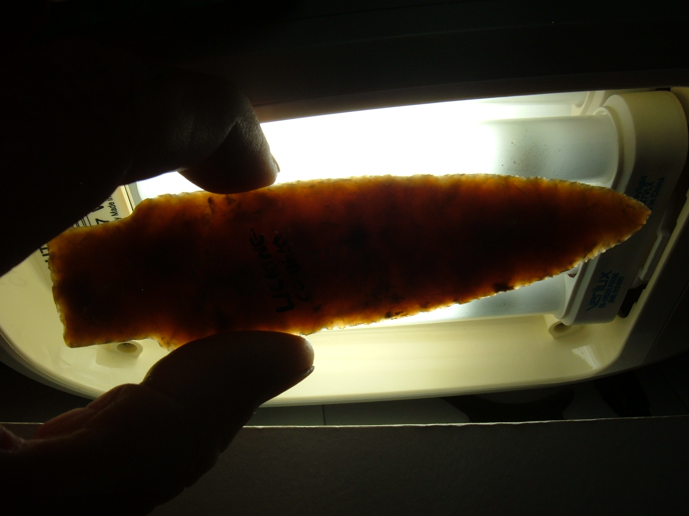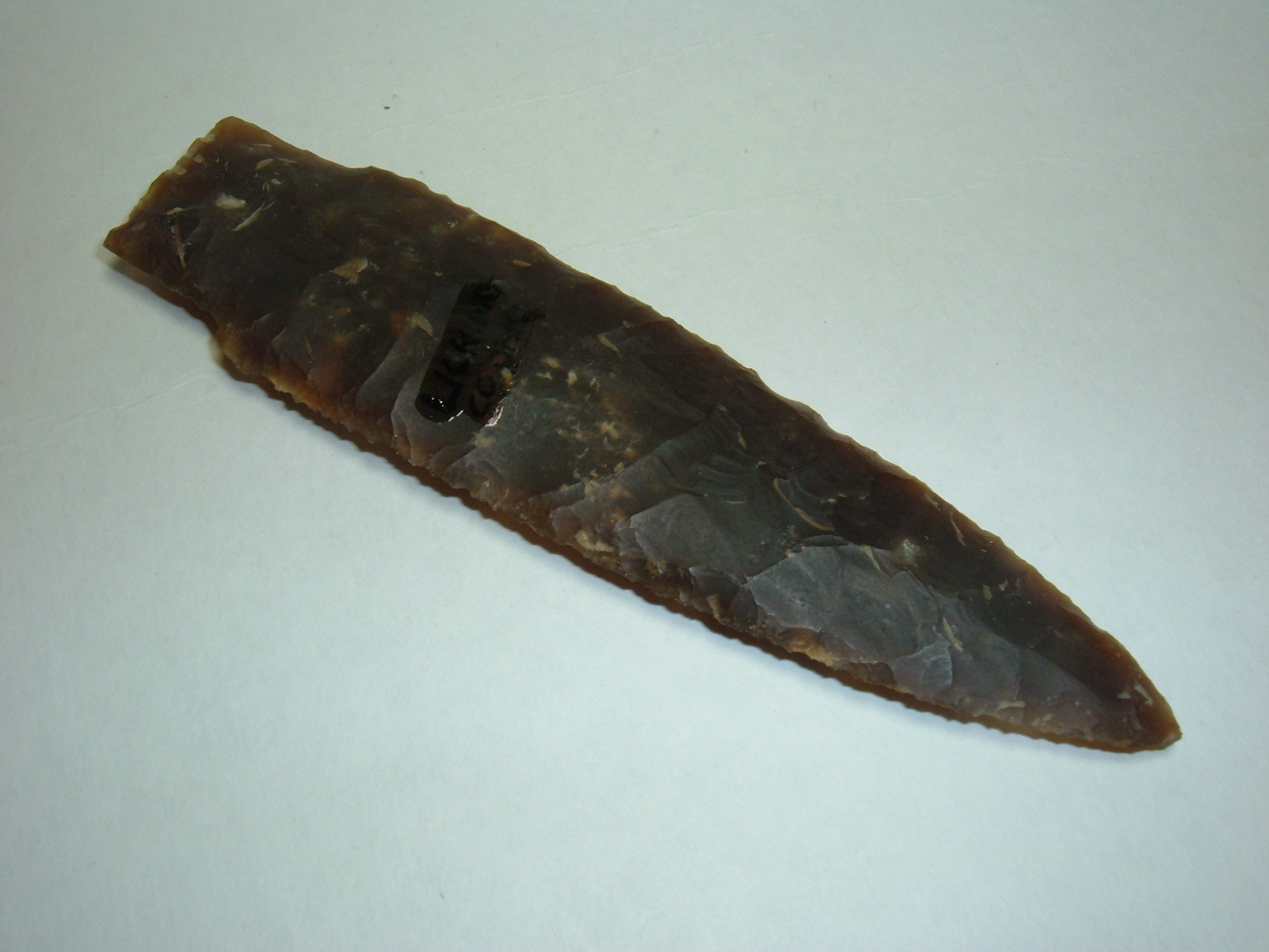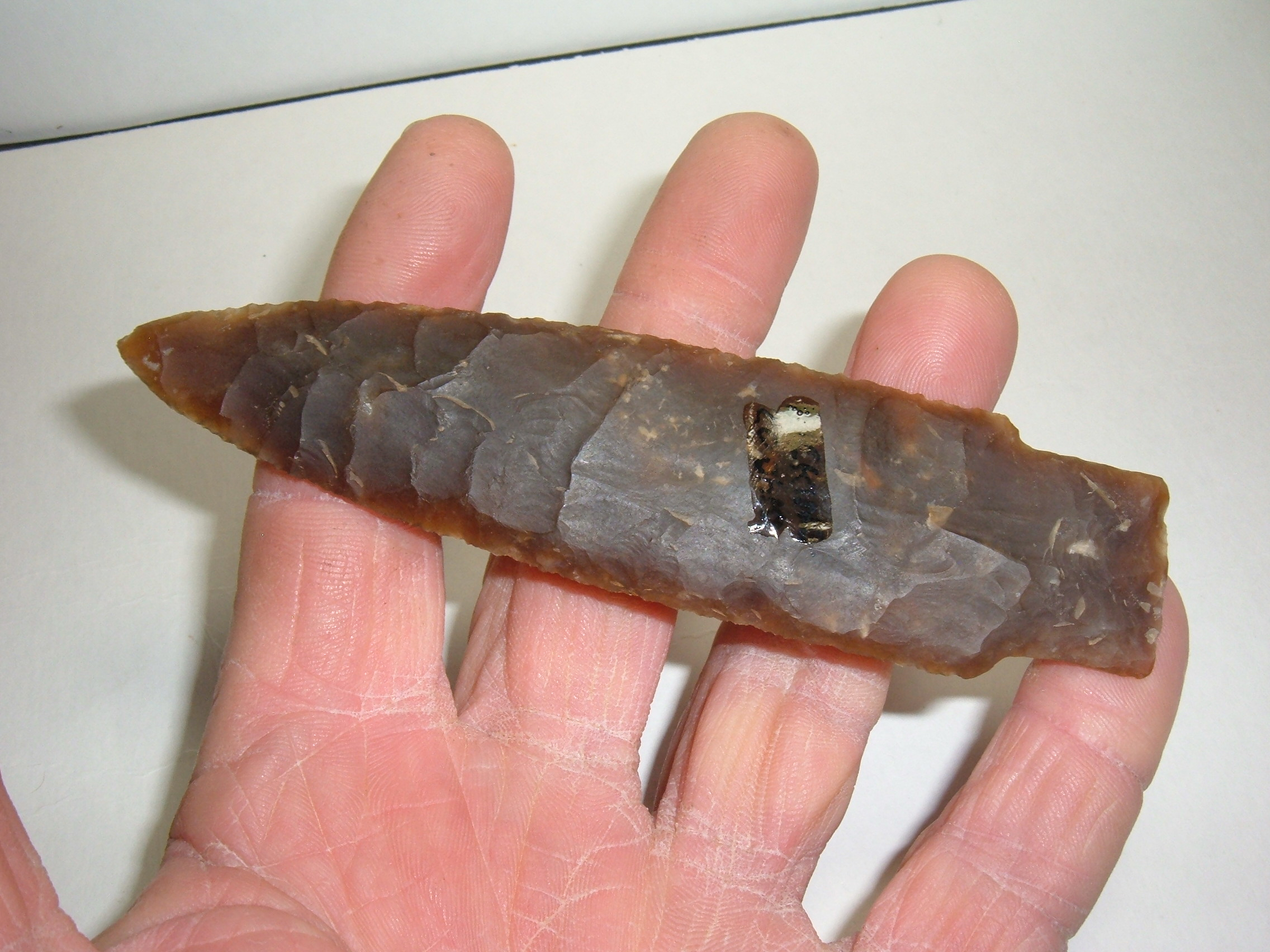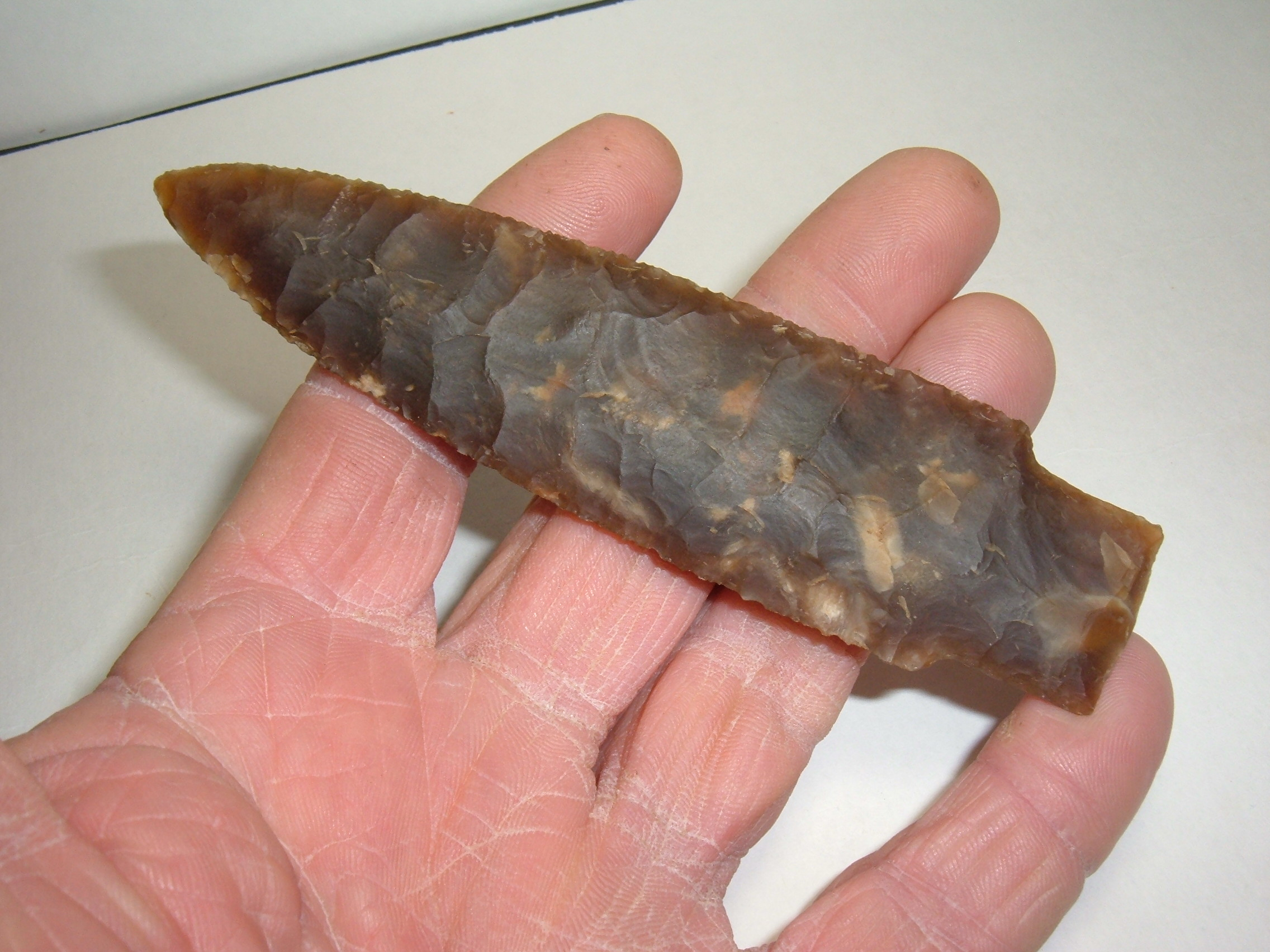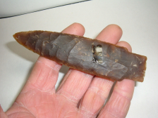 RIGHT UP AT THE TOP OF IT'S GAME THIS EXTREMELY TRANSLUCENT MOSS AGATE FLINT RIDGE PALEO STEMMED LANCE IS AMAZING IN EVERY WAY!FOUND 1 MILE EAST OFFLINT RIDGE,LICKING CO.OHIO AND IS A PERSONAL FIND OF TERRY YERIAN, A VERY WELL KNOWN AND RESPECTED OHIO COLLECTOR! THIS GIANT HIGHLY TRANSPARENT LANCE IS 4 13/16", IMPECCABLY KLAKED AND VERY THIN! THEY DO NOT COME A WHOLE LOT BETTER !
