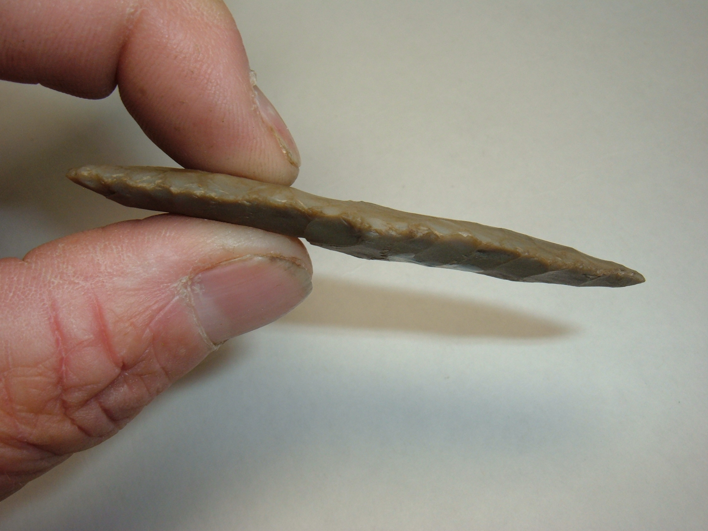 HERE WE HAVE ANOTHER WONDERFUL EARLY OALEO CLOVIS POINT,THIS ONE IS JUST A TOUCH UNDER 3" AT 2 15/16" AND CAME OUT OF THE FAMOUS GILBERT DILLEY COLLECTION. IT IS ALSO EX ENSPAUGH AND WAS FOUND IN TUSCAWARAS CO.OHIO! MATERIAL IS COSHOCTON GRAY FLINT ,SUPER FLUTING ON BOTH SIDES AND AN INCREDIBLE VALUE