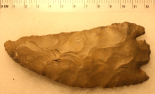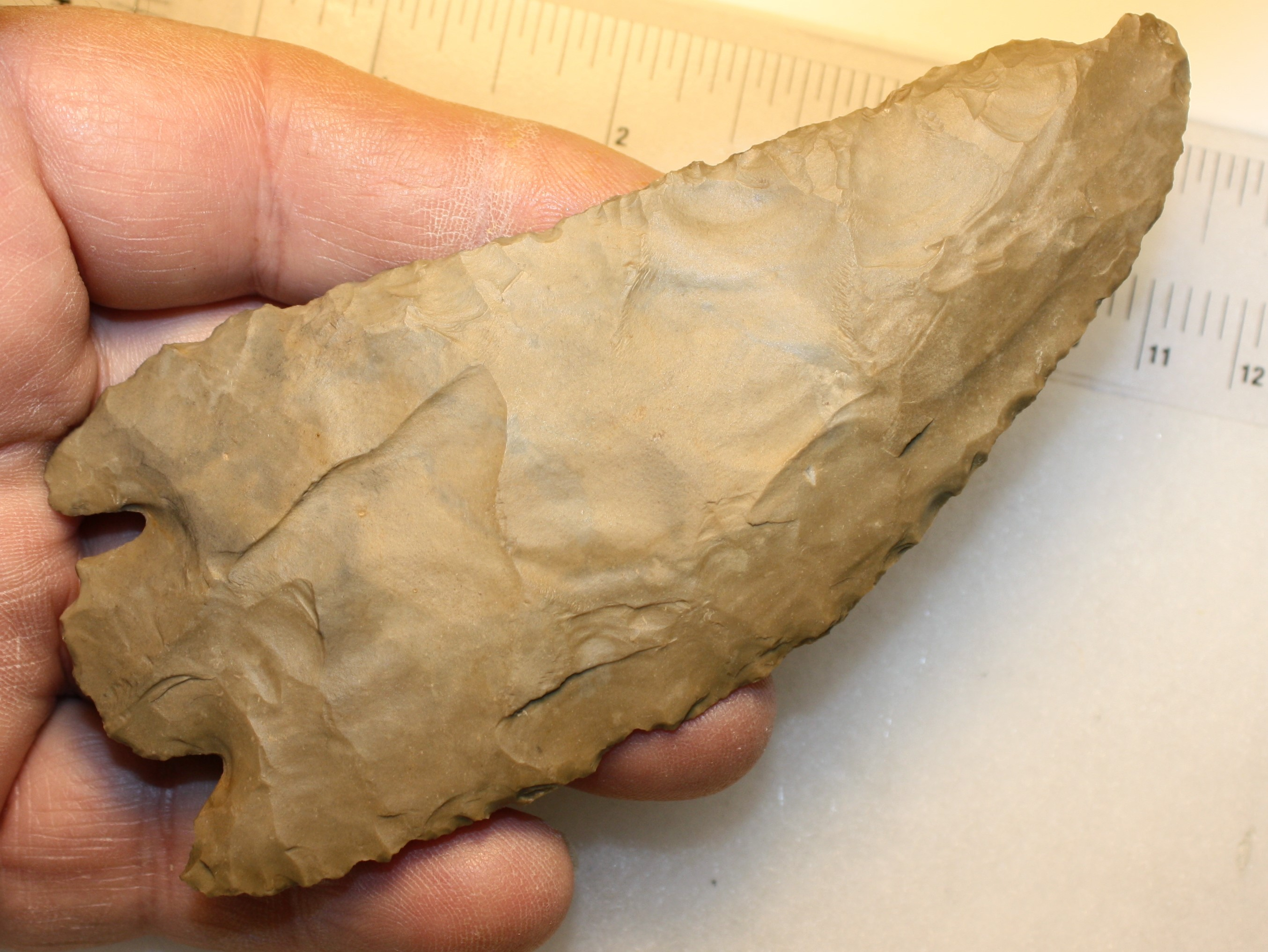This is a larger size Base Tang Knife that is over 4 1/2 inches long and about 2 1/2 inches wide. It has nice flaking and heavy use wear and patina.