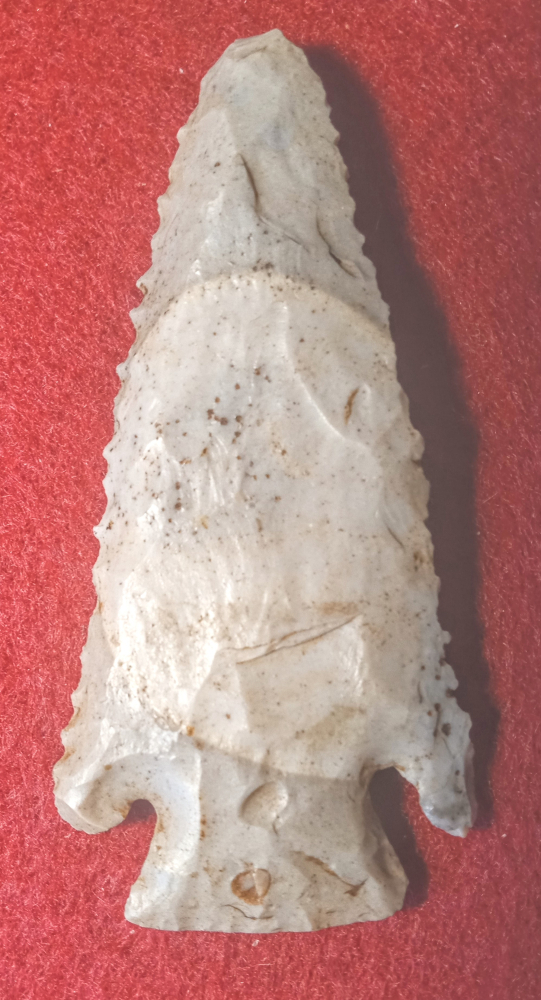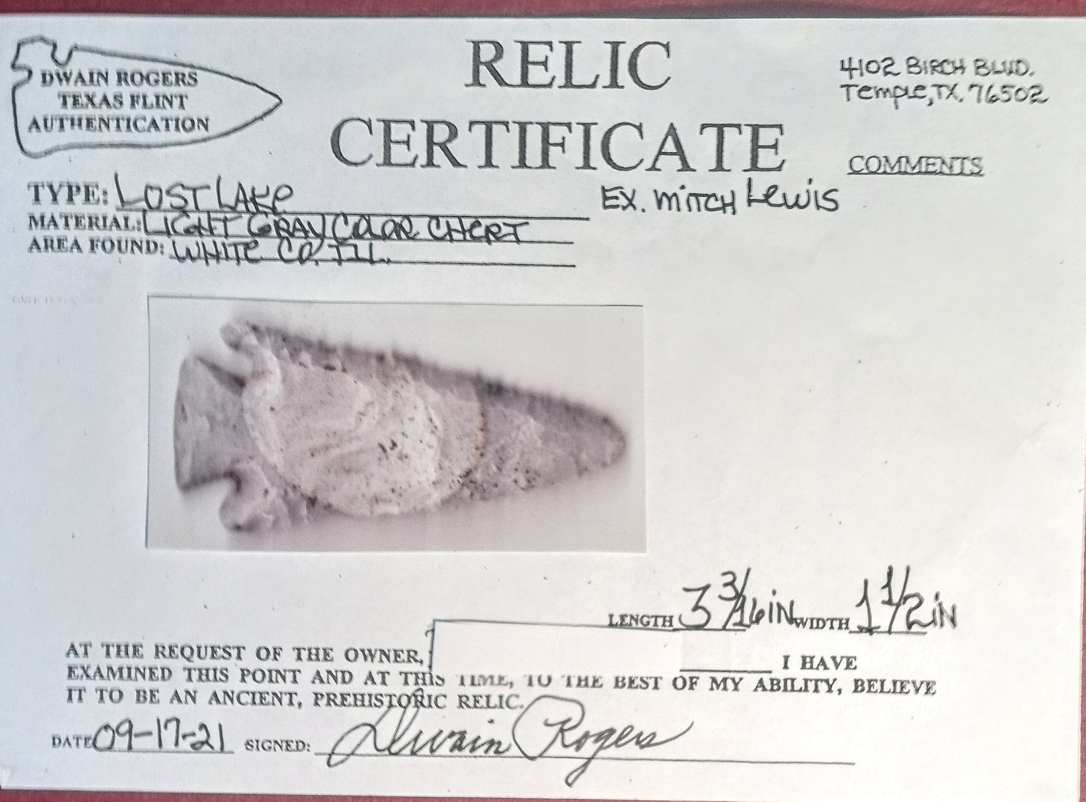 A stunning gray, Lost Lake knife made of Hornstone with beveled edges and a splendid bullseye pattern showing on each side. This artifact was found in White Co., Illinois and comes with a Dwain Rogers COA.