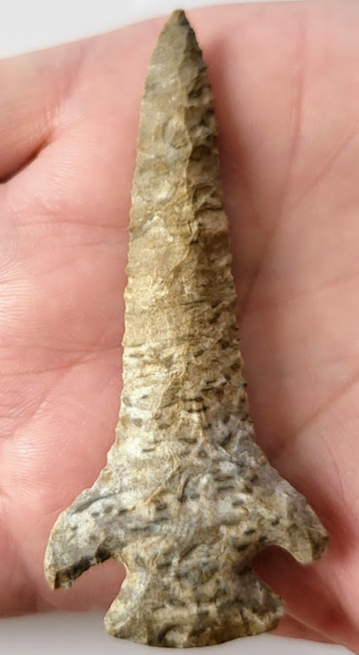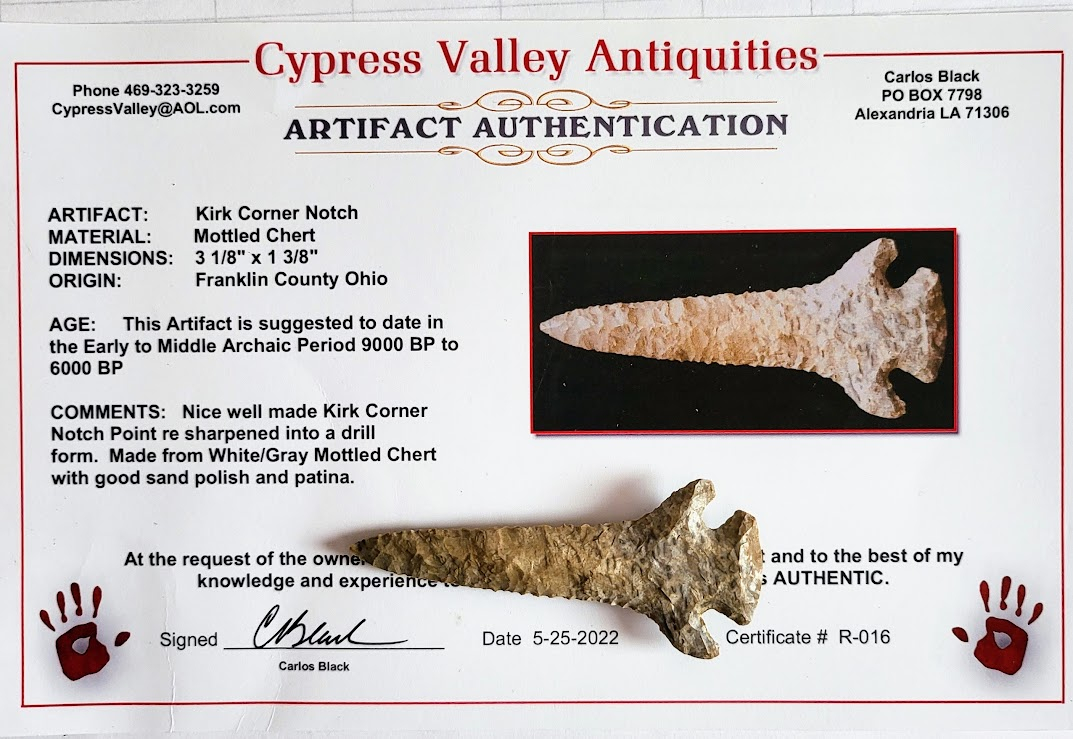 This very symmetrical Kirk Corner Notch Drill is made of white and gray mottled chert and was probably a knife that was later re-sharpened into a drill form. The drill was found in Franklin County, Ohio and comes with a COA from Carlos Black. Some people have suggested this is a Pine Tree Point but it was papered as a Kirk Corner Notch by Carlos Black.