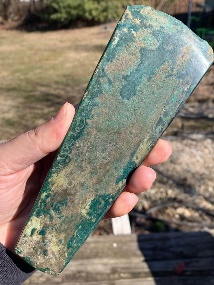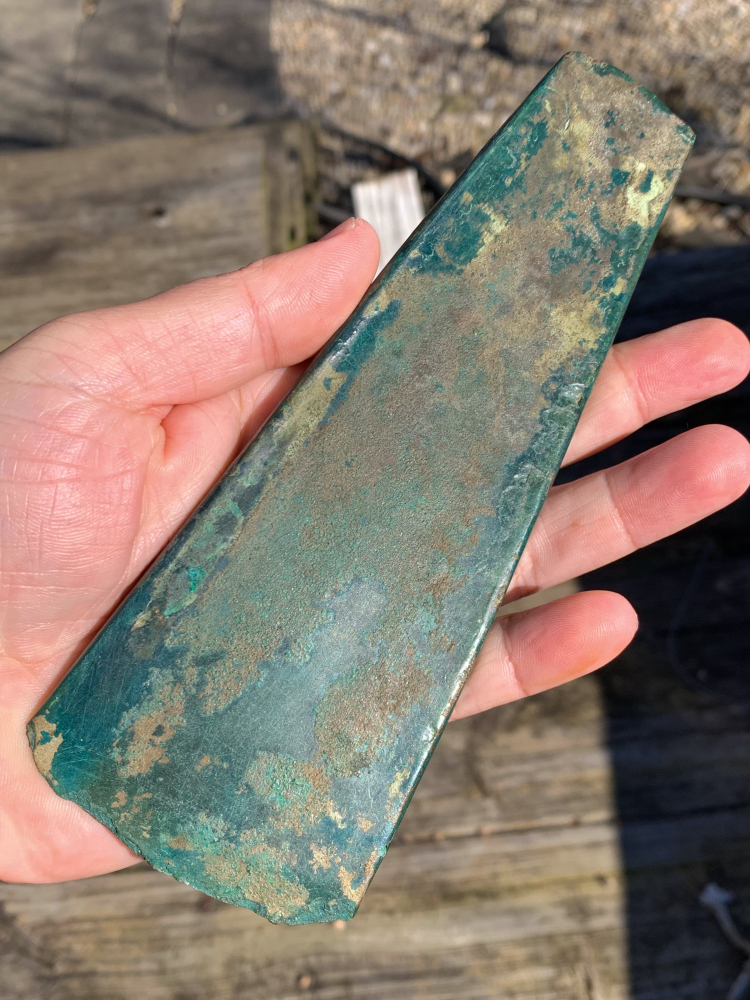 Free shipping, A massive 7 1/4” Bronze axe, this example is covered in a great patina and has been highly polished .