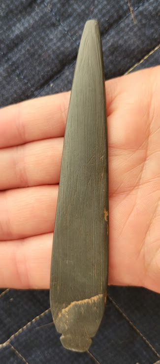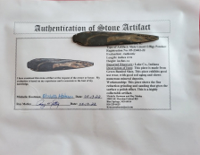 This is an example of a very rare, polished slate Effigy Pendant. It is large for the type at 4 5/8". This pendant was found in Lake Co., Indiana and comes with a Roy Motley COA. Note: The tip of the pendant appears to have been smoothed indicating that it has not been broken but was made that way.