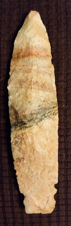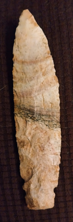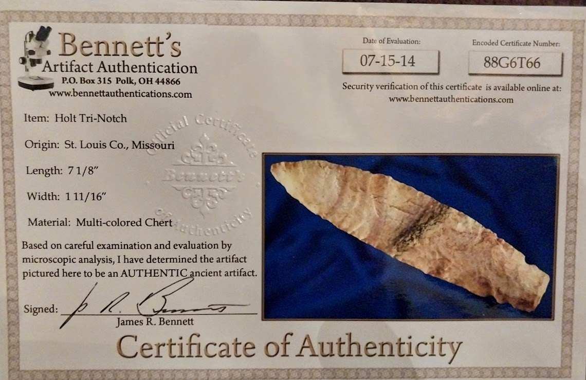 This gigantic Holt Tri-Notch knife is one of the rarest artifacts in the New World. This particular example was found in St. Louis Co., Missouri and comes with a Jim Bennett COA. The Holt Tri-Notch is so scarce that it isn't even listed in Overstreet or on internet artifact identification sites. In fact, mention of this type artifact can only be found in a few archaeology publications. If owning something that no one else has in their collection is your forte, this Holt Tri-Notch is for you!