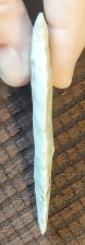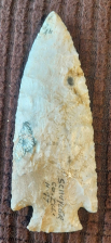 This is one of the more unusual artifacts you'll see. It's a premium 4" Hardin with perfect symmetry and form displaying a large, detailed coral fossil on both sides. It is made of Burlington chert and was found in Schuyler Co., Illinois. It comes with a Dwain Rogers COA.