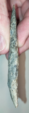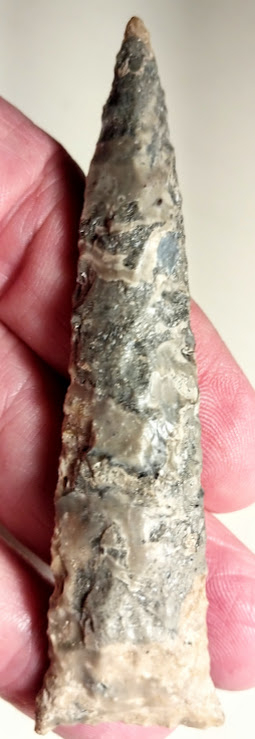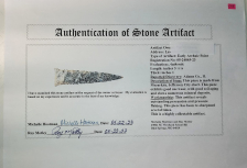This well-flaked, early Archaic Knife is very symmetrical and made out of a striking bluish Mozarkite chert. The knife was found in Adams Co., Illinois and comes with a Roy Motley COA.