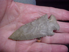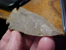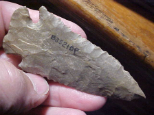 Shipping cost included with the price. on this ex Pesch Collection Dovetail. The auction information for Bill's collection did not indicate if he found or bought the big 3.25" by 1&7/16", ONLY 1/4" thick Early Archaic point there in Fayette County, or if it was it from a dealer he trusted. You now have the history I got with the piece. It's a mottled type of Hornstone, patinated and with a few old nicks and dings to its history (see the tiny impact fracture on the side of the tip, for one, and I note some ancient salvage/ repair to the insides of the Dovetail stem. The barbs, the basal grinding, excellent workmanship. The tip has that needle point of a burin. Authentic, period. I welcome checks or M.O.s but please note I DO NOT take paypal--Roy a.