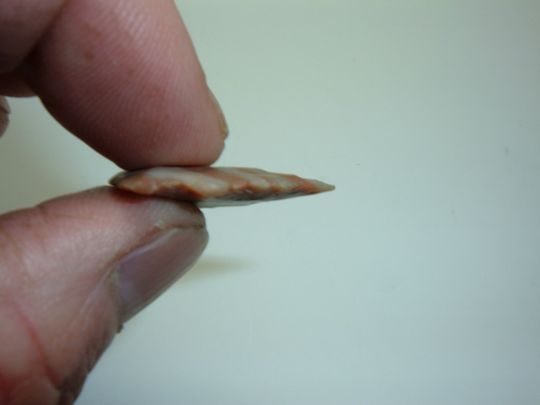 THIS STRIPED EX BOB CONVERSE COLLECTION, ARCHAIC CORNER NOTCH IS A TRUE RELIC OF BEAUTY!FOUND IN FAIRFIELD CO.OHIO IT IS PICTURED IN THE BOOK "THE ARTFACT COLLECTION OF ROBERT CONVERSE PAGE 142! 1 1'8" AND MATERIAL IS THE FINEST EXOTIC FLINT RIDGE FLINT! ORANGE STRIPING THROUGHOUT,A REAL LITTLE GEM OF A POINT!
